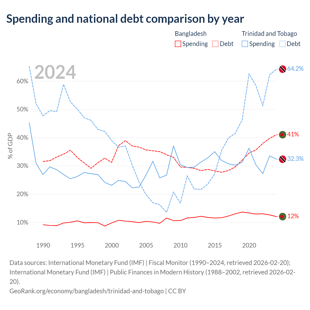 Bangladesh has $184B in government debt (41% of GDP), compared to $16.5B (64.2% of GDP) in Trinidad and Tobago.