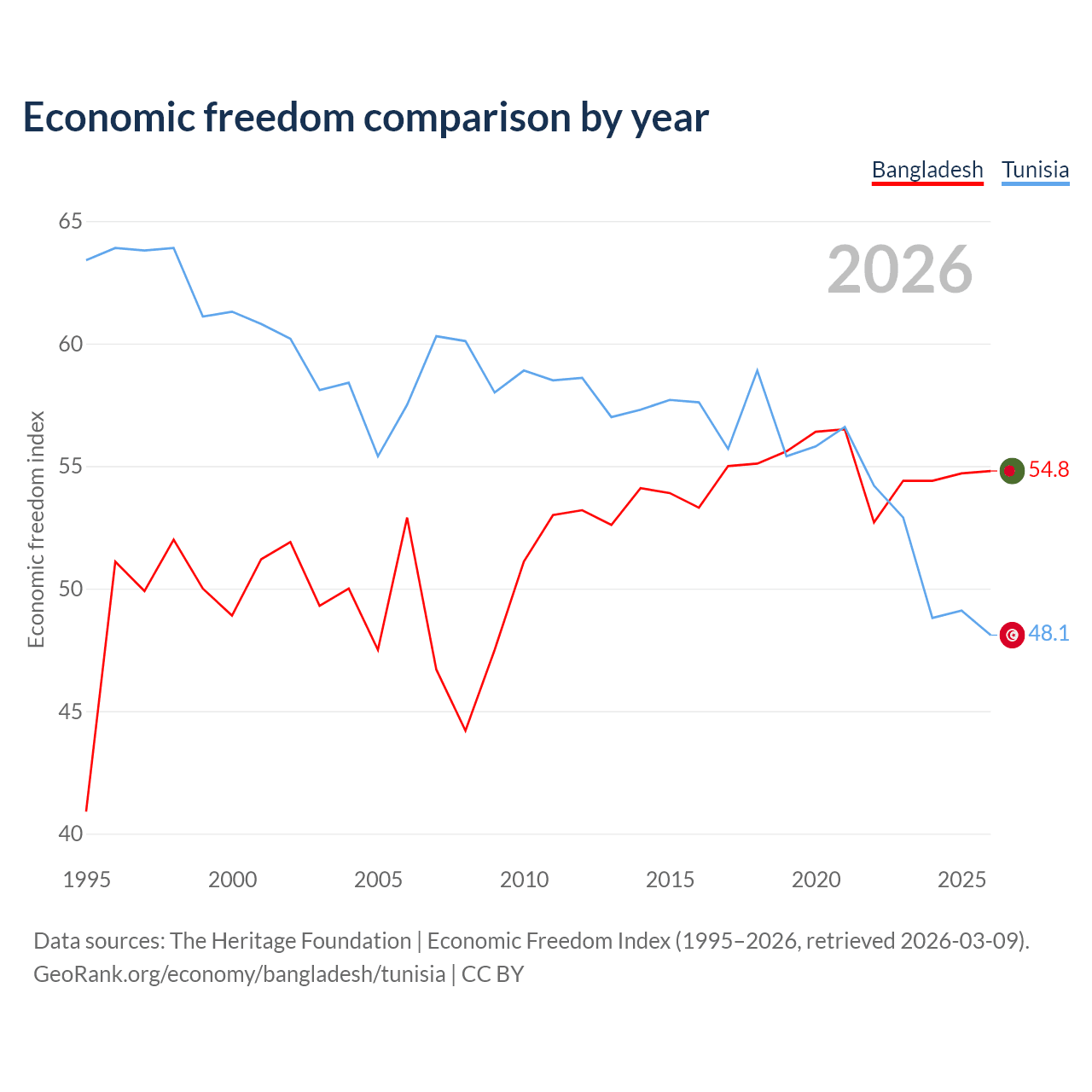 The Economic Freedom Index for Bangladesh is 54.8, ranking 131/197, compared to 48.1 for Tunisia, ranking 172/197. The chart above displays a comparison of annual changes in economic freedom indexes.