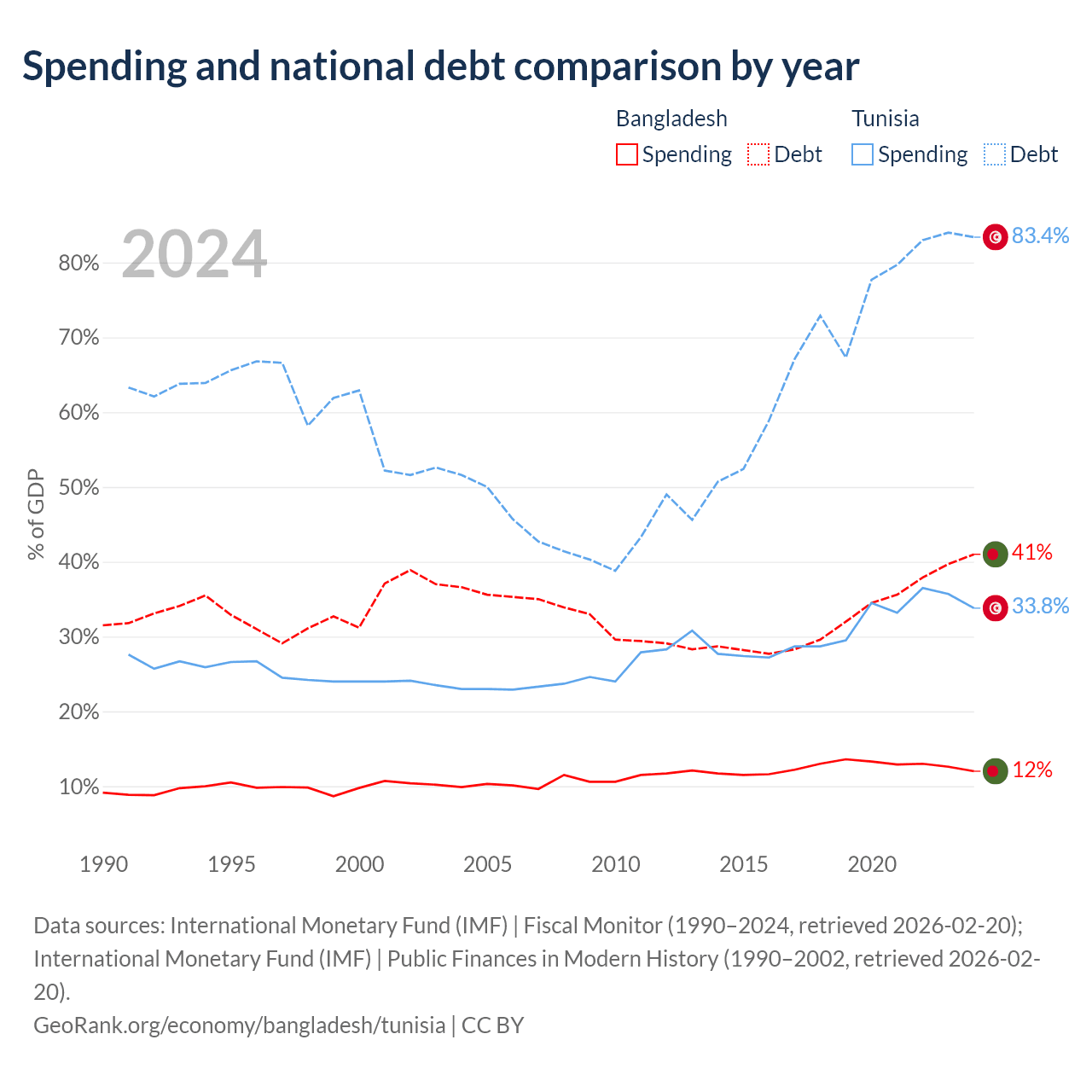 Bangladesh has $184B in government debt (41% of GDP), compared to $42.8B (83.4% of GDP) in Tunisia.