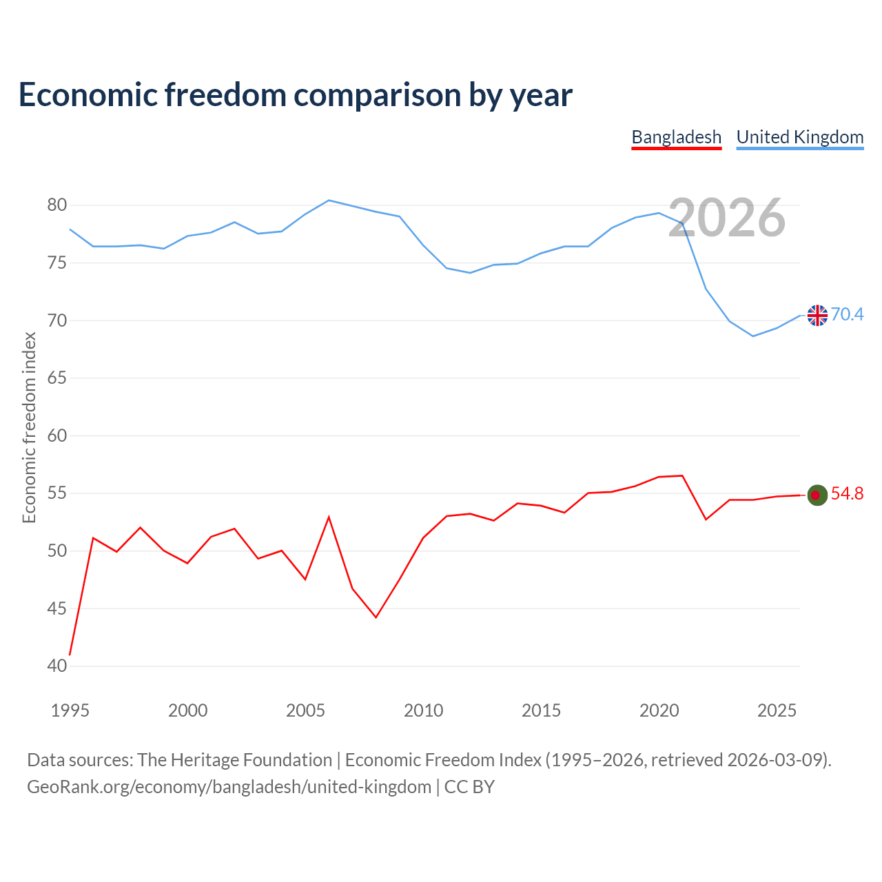 The Economic Freedom Index for Bangladesh is 54.8, ranking 131/197, compared to 70.4 for the United Kingdom, ranking 35/197. The chart above displays a comparison of annual changes in economic freedom indexes.