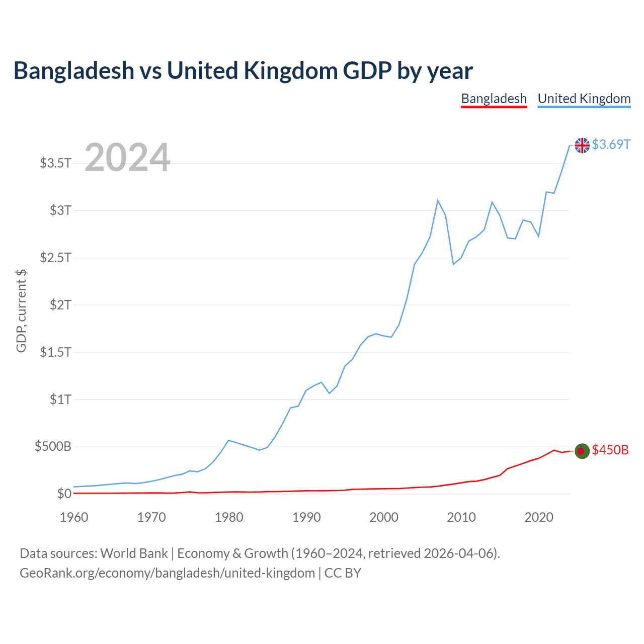 Bangladesh has a GDP of $450B compared to $3.69T for the United Kingdom, ranking 36/197 and 6/197 by economy size, respectively.