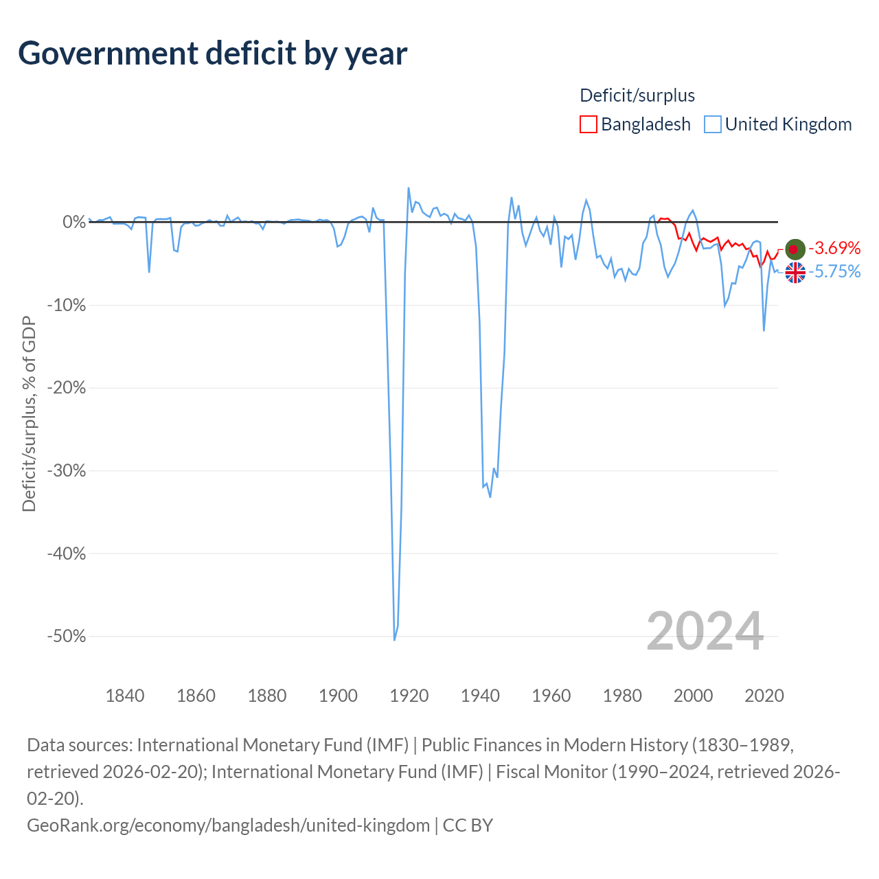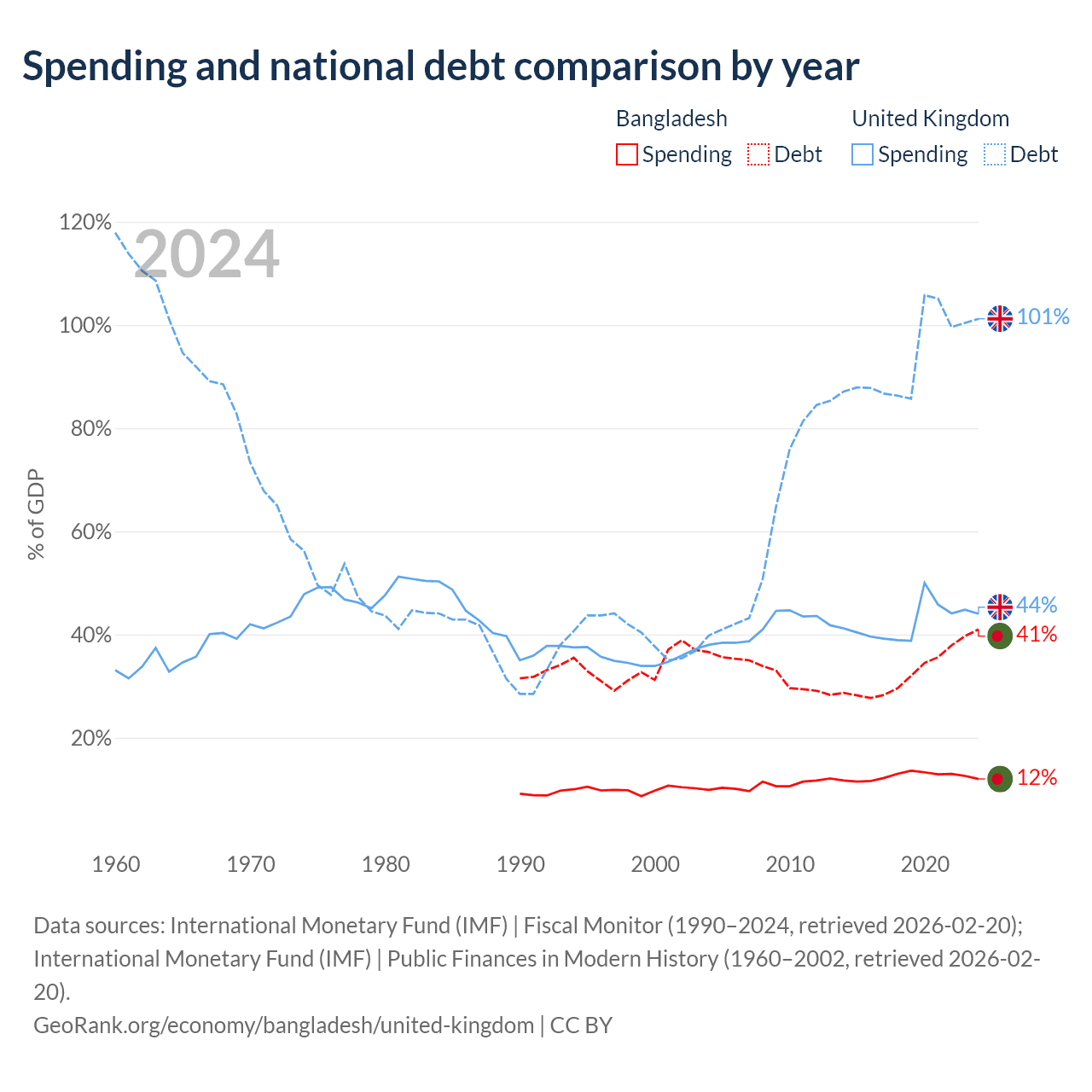 Bangladesh has $184B in government debt (41% of GDP), compared to $3.73T (101.2% of GDP) in the United Kingdom.