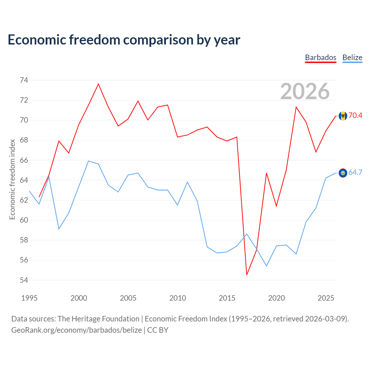 The Economic Freedom Index for Barbados is 70.4, ranking 34/197, compared to 64.7 for Belize, ranking 71/197. The chart above displays a comparison of annual changes in economic freedom indexes.