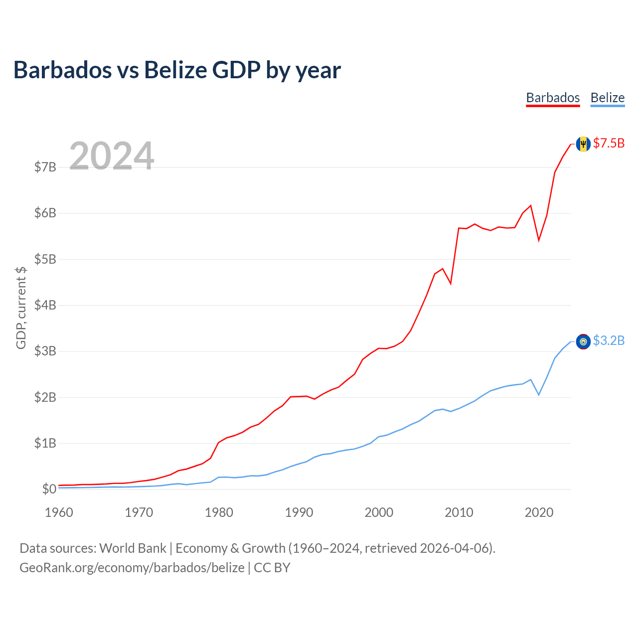 Barbados has a GDP of $7.5B compared to $3.2B for Belize, ranking 157/197 and 168/197 by economy size, respectively.