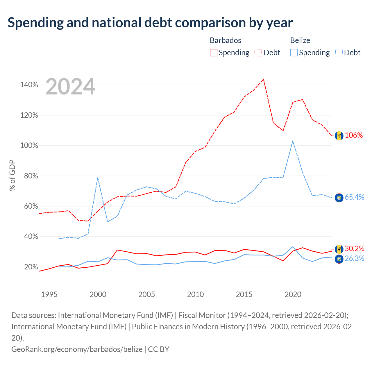 Barbados has $7.97B in government debt (106.3% of GDP), compared to $2.1B (65.4% of GDP) in Belize.