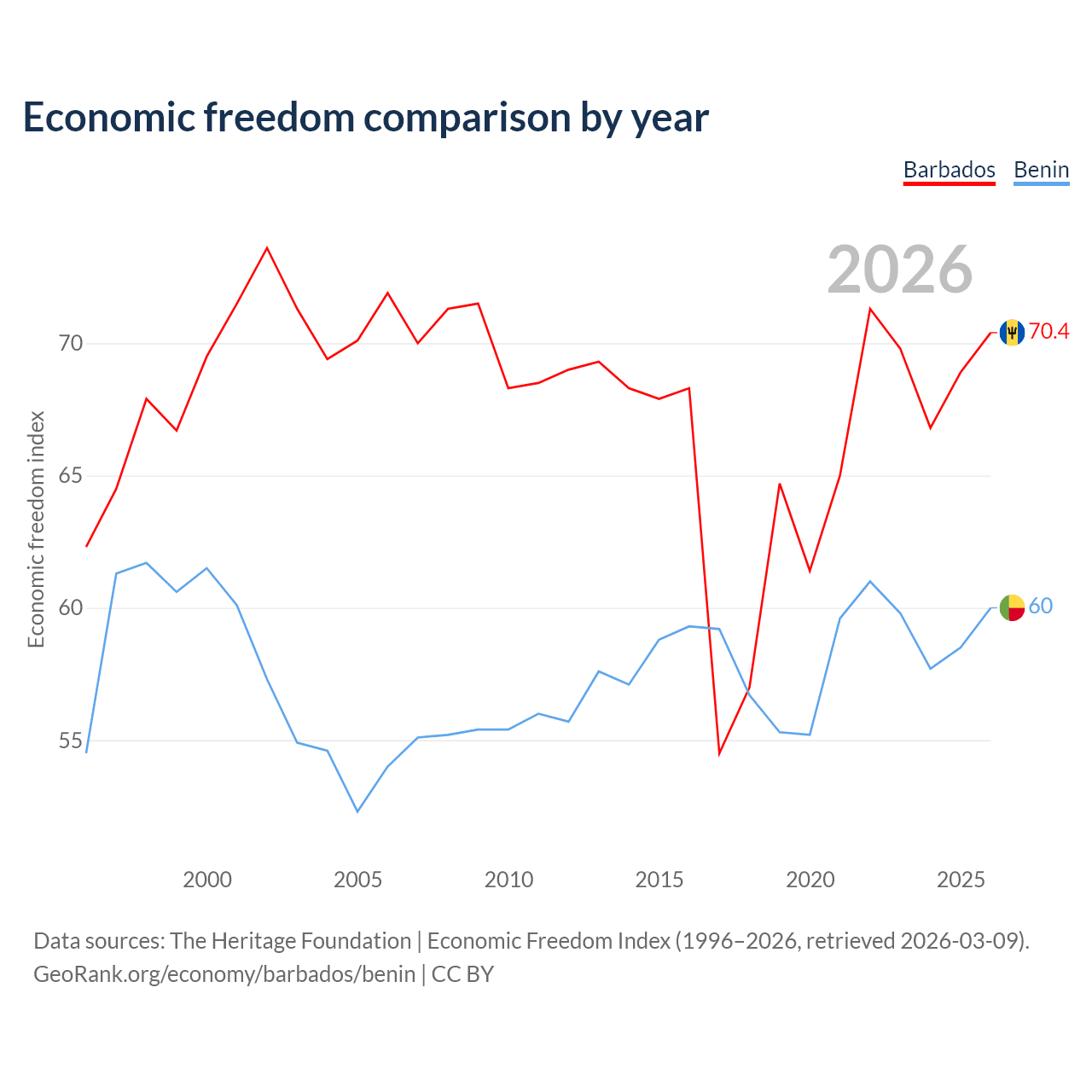 The Economic Freedom Index for Barbados is 70.4, ranking 34/197, compared to 60 for Benin, ranking 96/197. The chart above displays a comparison of annual changes in economic freedom indexes.