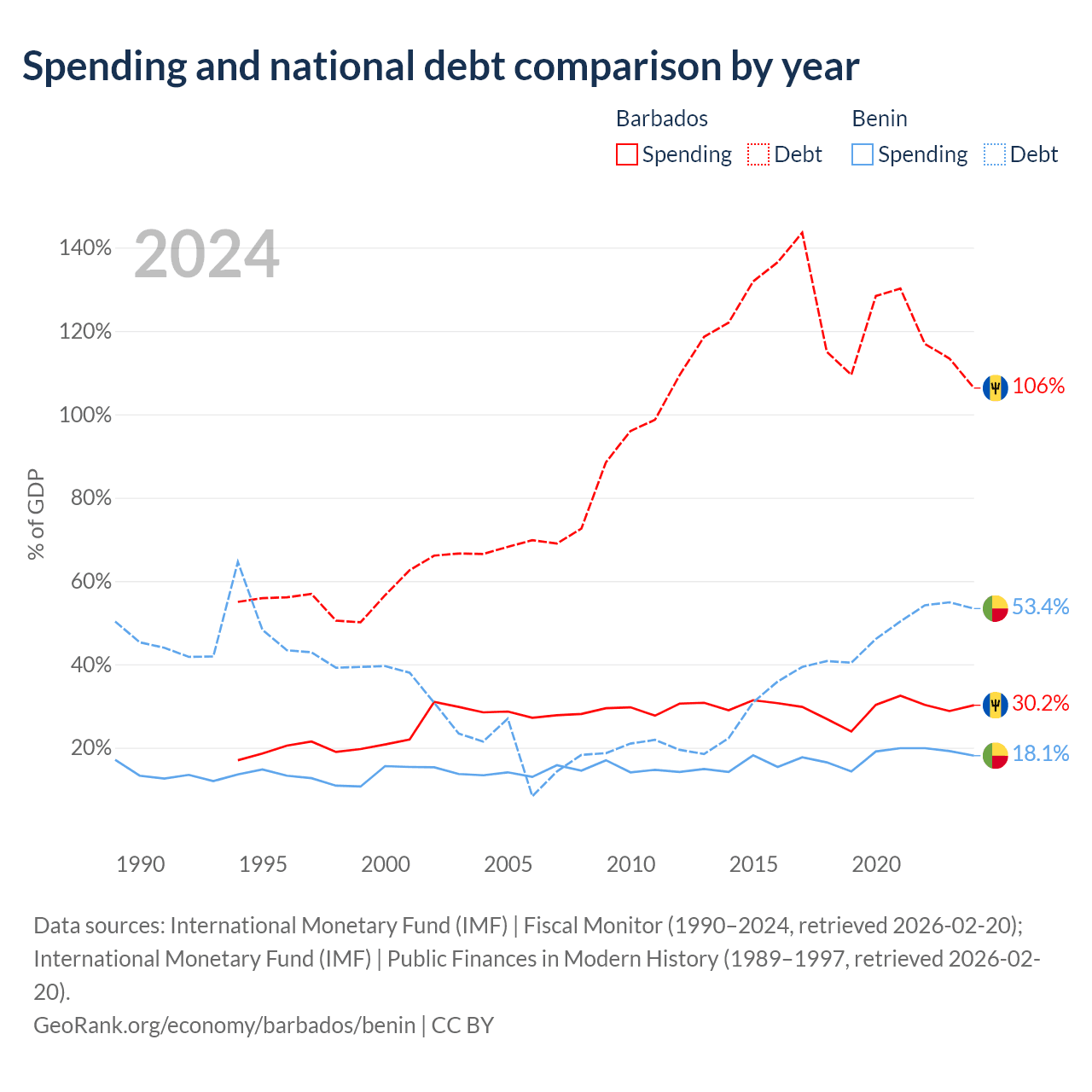 Barbados has $7.97B in government debt (106.3% of GDP), compared to $11.5B (53.4% of GDP) in Benin.