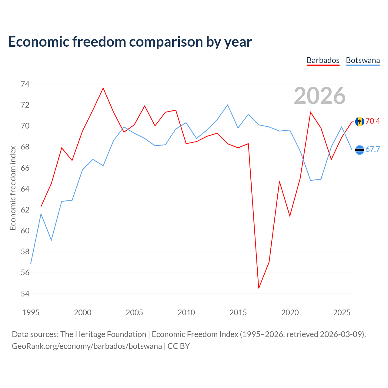 The Economic Freedom Index for Barbados is 70.4, ranking 34/197, compared to 67.7 for Botswana, ranking 53/197. The chart above displays a comparison of annual changes in economic freedom indexes.