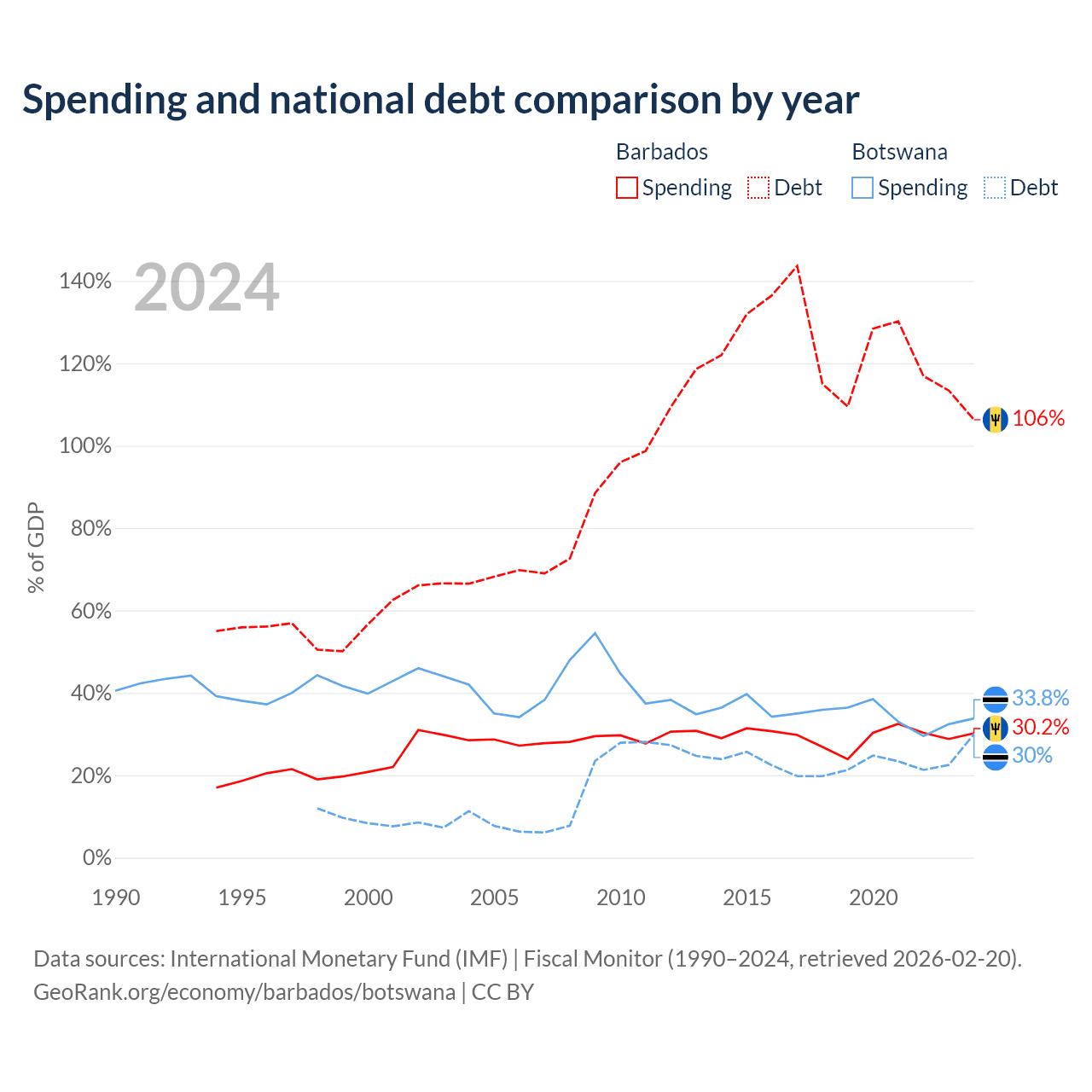 Barbados has $7.97B in government debt (106.3% of GDP), compared to $5.82B (30% of GDP) in Botswana.