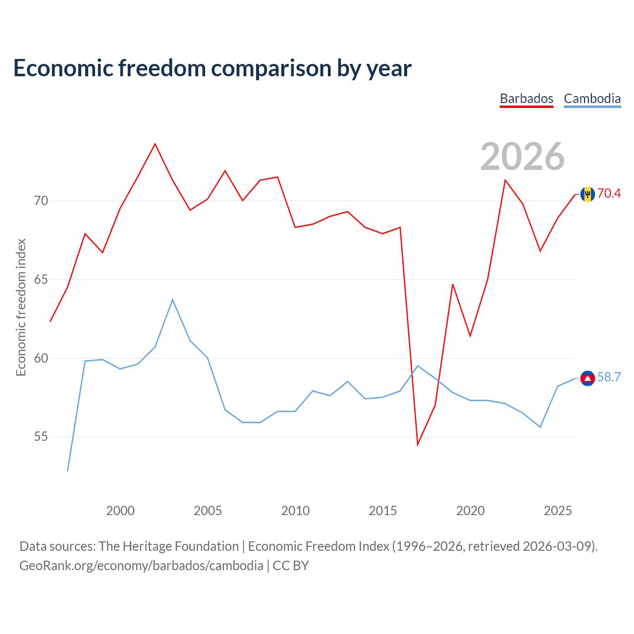 The Economic Freedom Index for Barbados is 70.4, ranking 34/197, compared to 58.7 for Cambodia, ranking 108/197. The chart above displays a comparison of annual changes in economic freedom indexes.