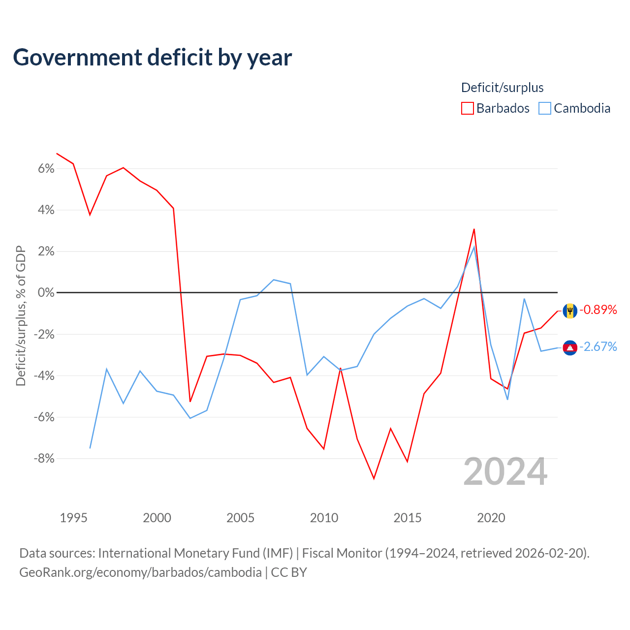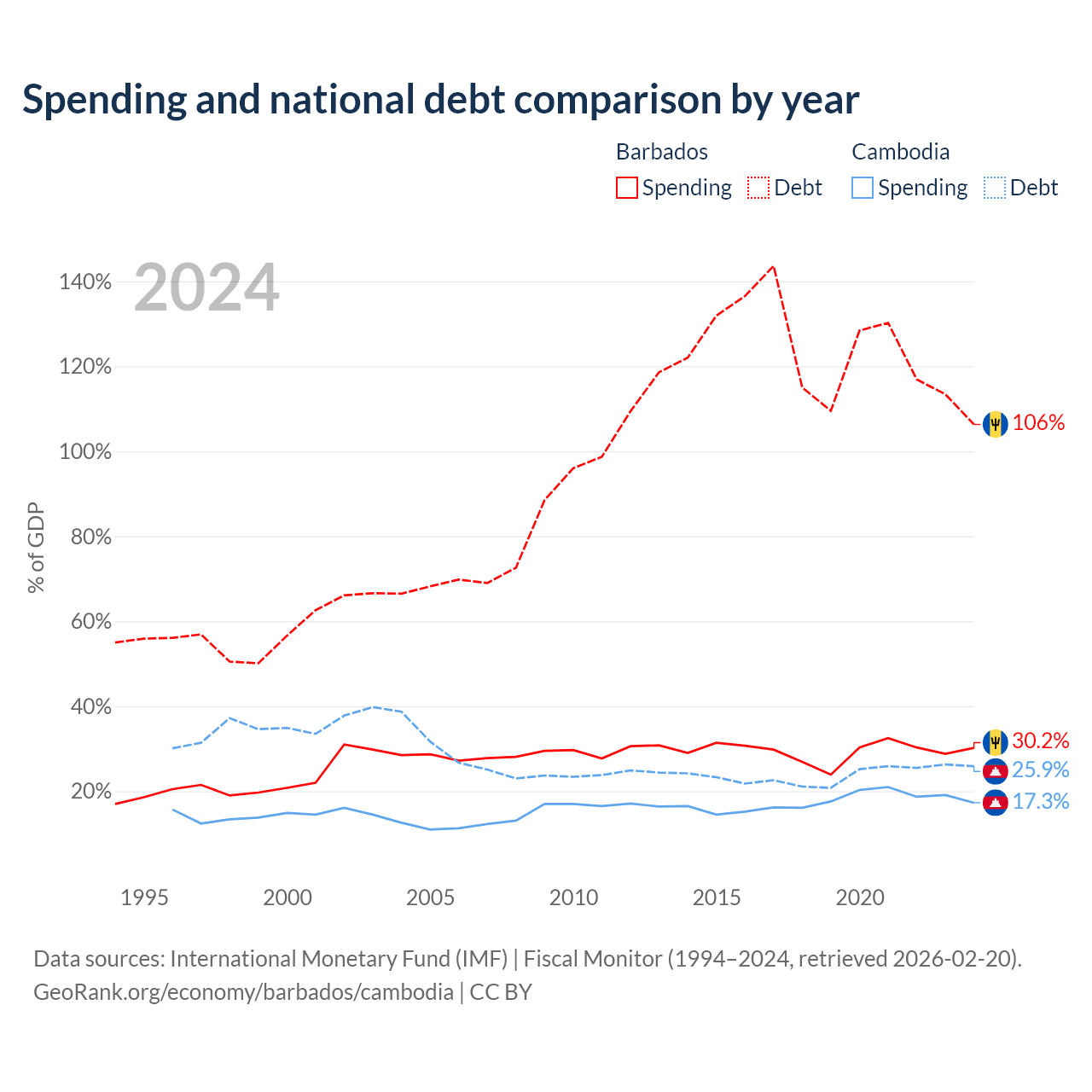 Barbados has $7.97B in government debt (106.3% of GDP), compared to $12B (25.9% of GDP) in Cambodia.