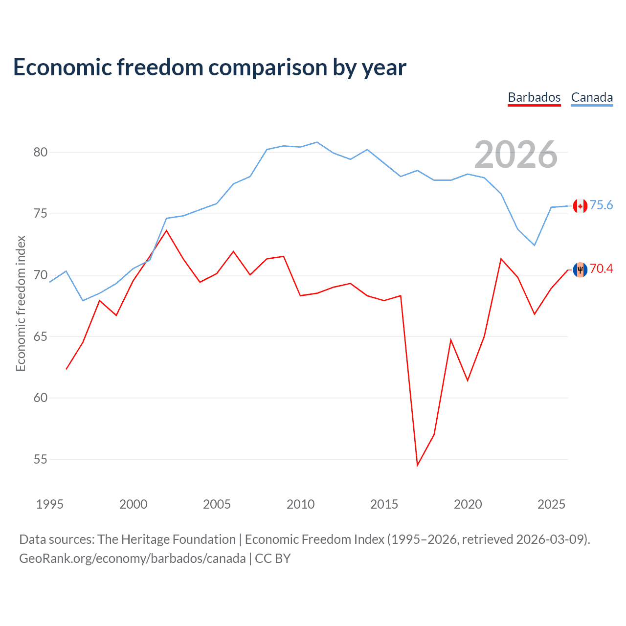 The Economic Freedom Index for Barbados is 70.4, ranking 34/197, compared to 75.6 for Canada, ranking 17/197. The chart above displays a comparison of annual changes in economic freedom indexes.