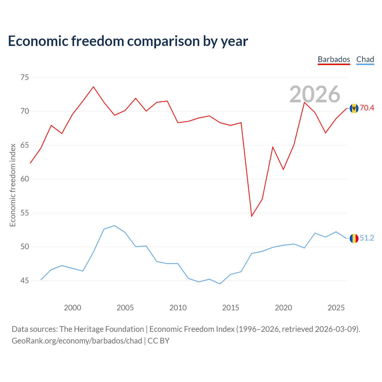 The Economic Freedom Index for Barbados is 70.4, ranking 34/197, compared to 51.2 for Chad, ranking 154/197. The chart above displays a comparison of annual changes in economic freedom indexes.
