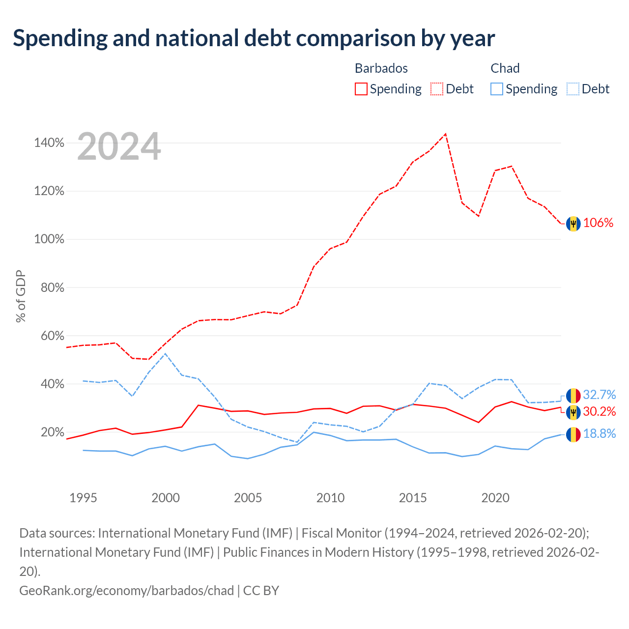 Barbados has $7.97B in government debt (106.3% of GDP), compared to $6.37B (32.7% of GDP) in Chad.