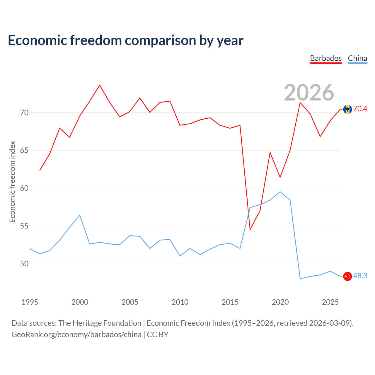 The Economic Freedom Index for Barbados is 70.4, ranking 34/197, compared to 48.3 for China, ranking 170/197. The chart above displays a comparison of annual changes in economic freedom indexes.