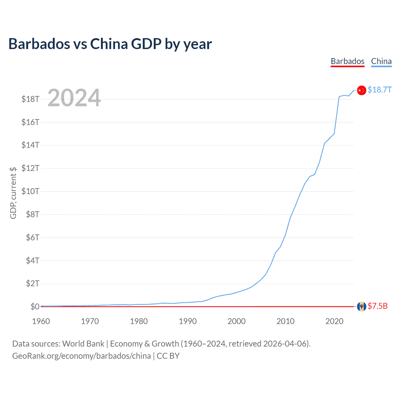 Barbados has a GDP of $7.5B compared to $18.7T for China, ranking 157/197 and 2/197 by economy size, respectively.