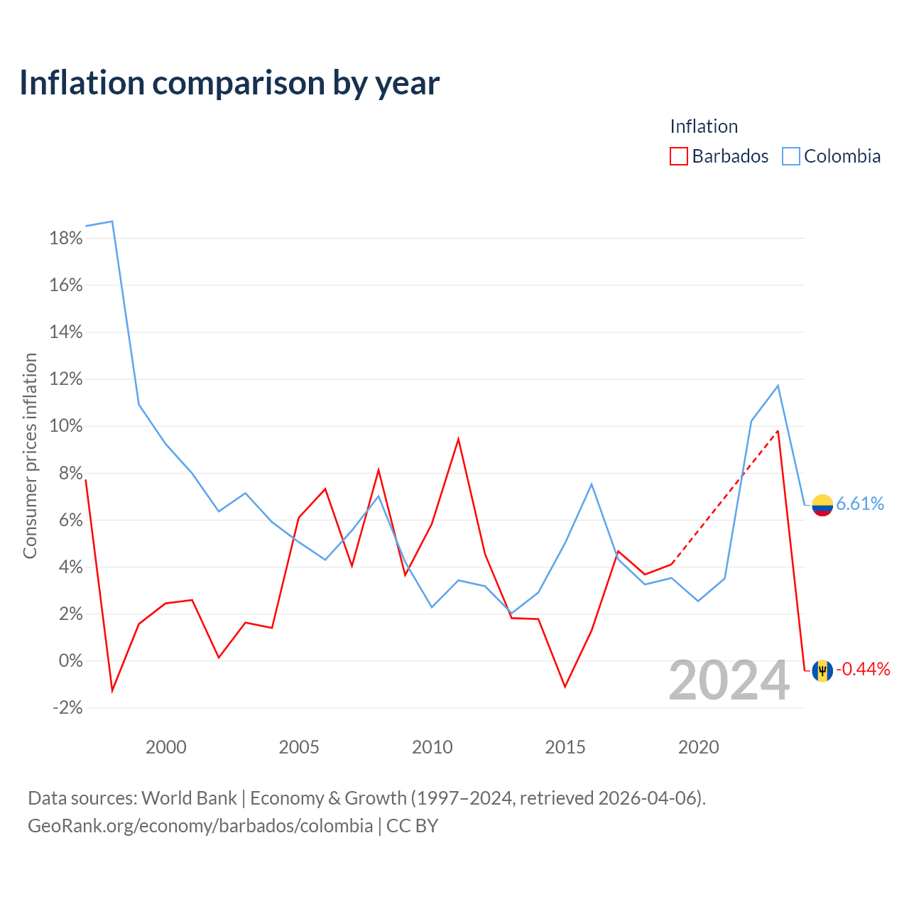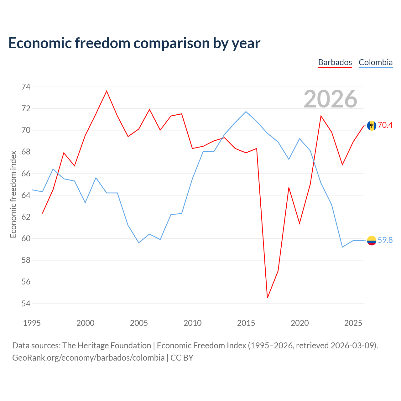 The Economic Freedom Index for Barbados is 70.4, ranking 34/197, compared to 59.8 for Colombia, ranking 101/197. The chart above displays a comparison of annual changes in economic freedom indexes.