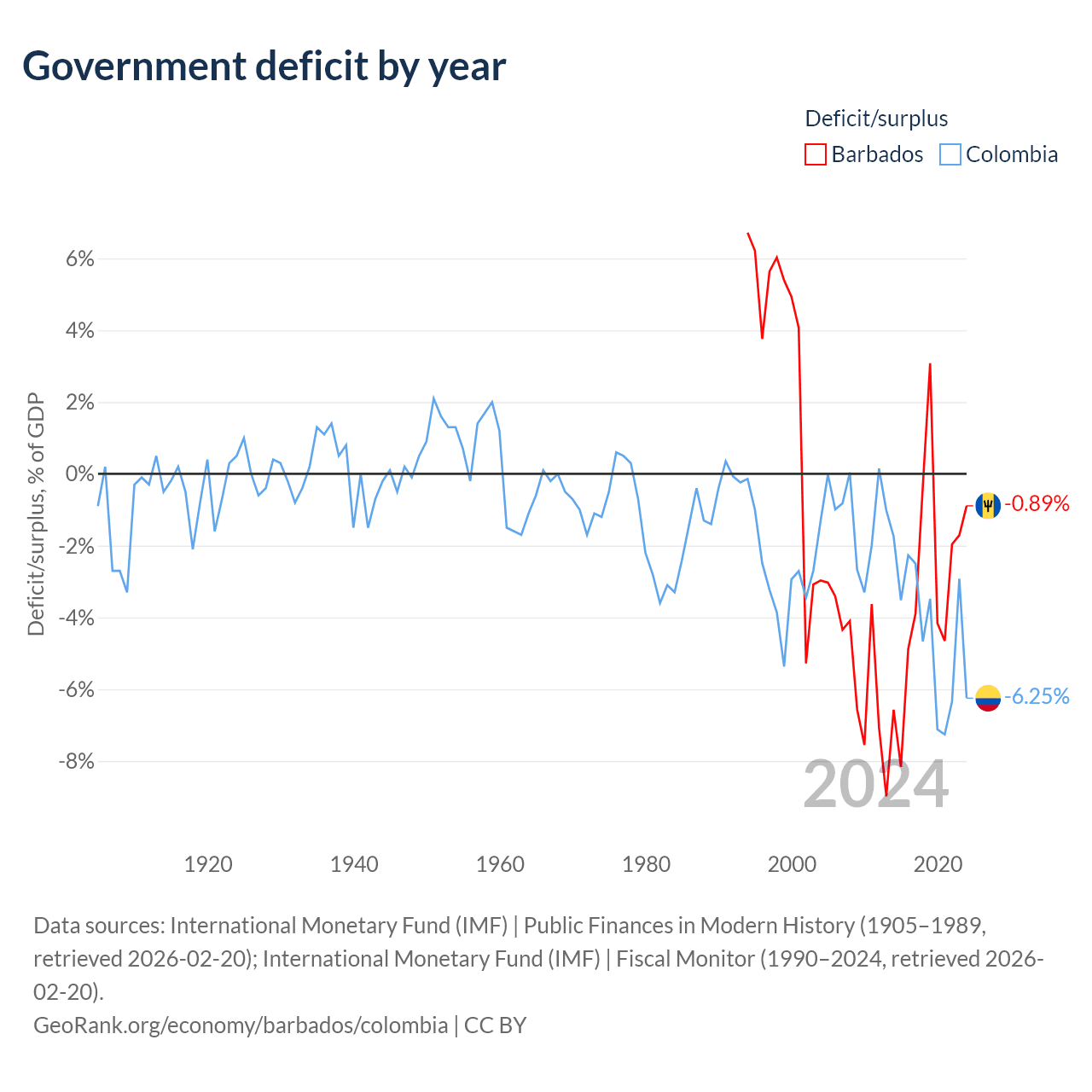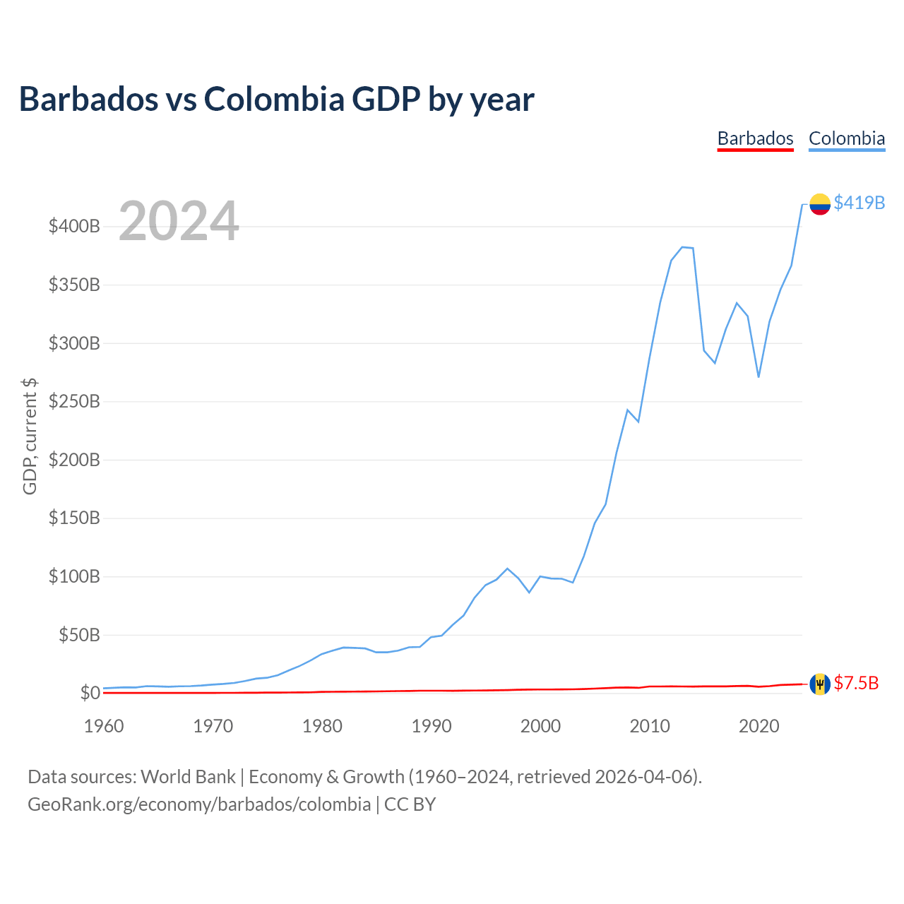 Barbados has a GDP of $7.5B compared to $419B for Colombia, ranking 157/197 and 39/197 by economy size, respectively.