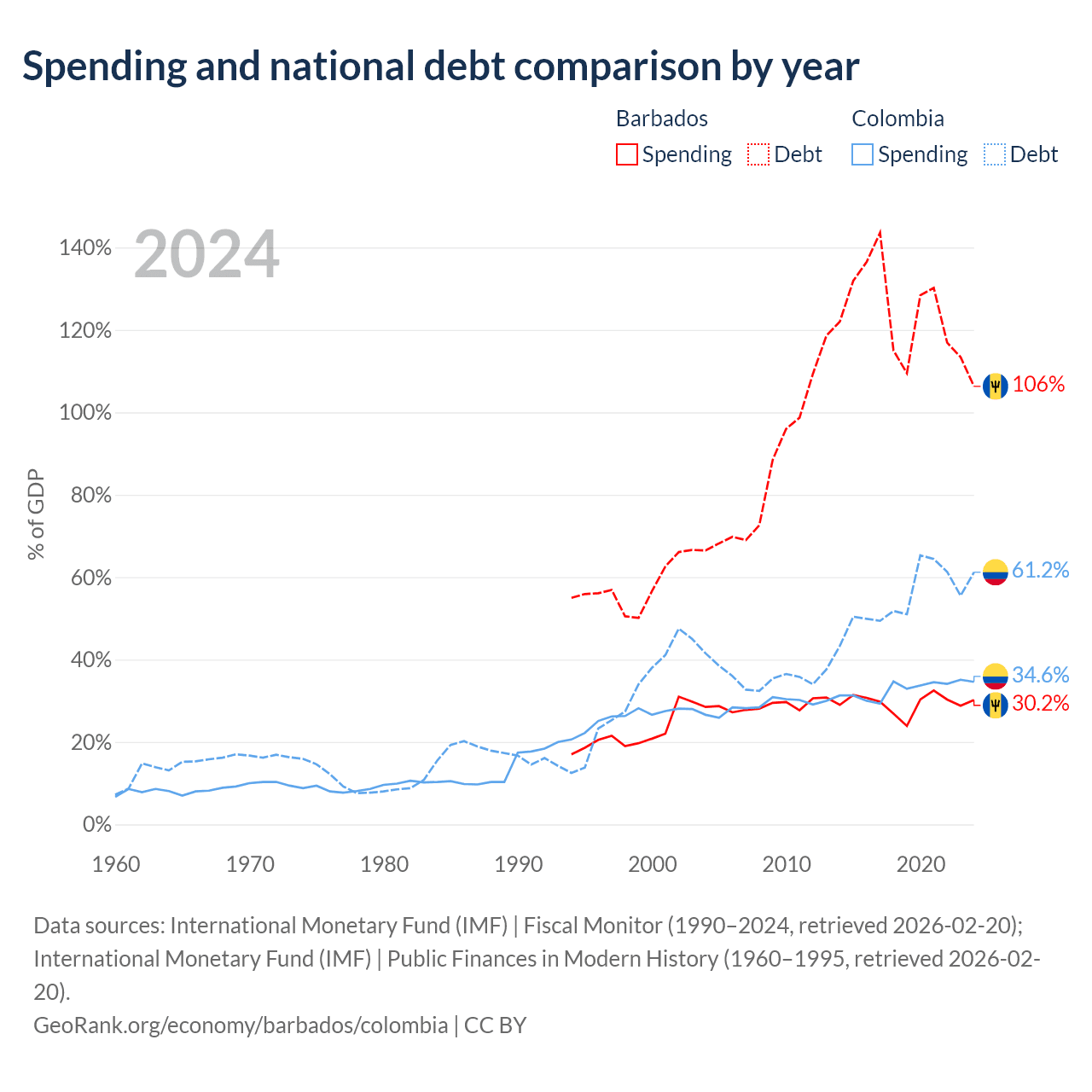 Barbados has $7.97B in government debt (106.3% of GDP), compared to $256B (61.2% of GDP) in Colombia.