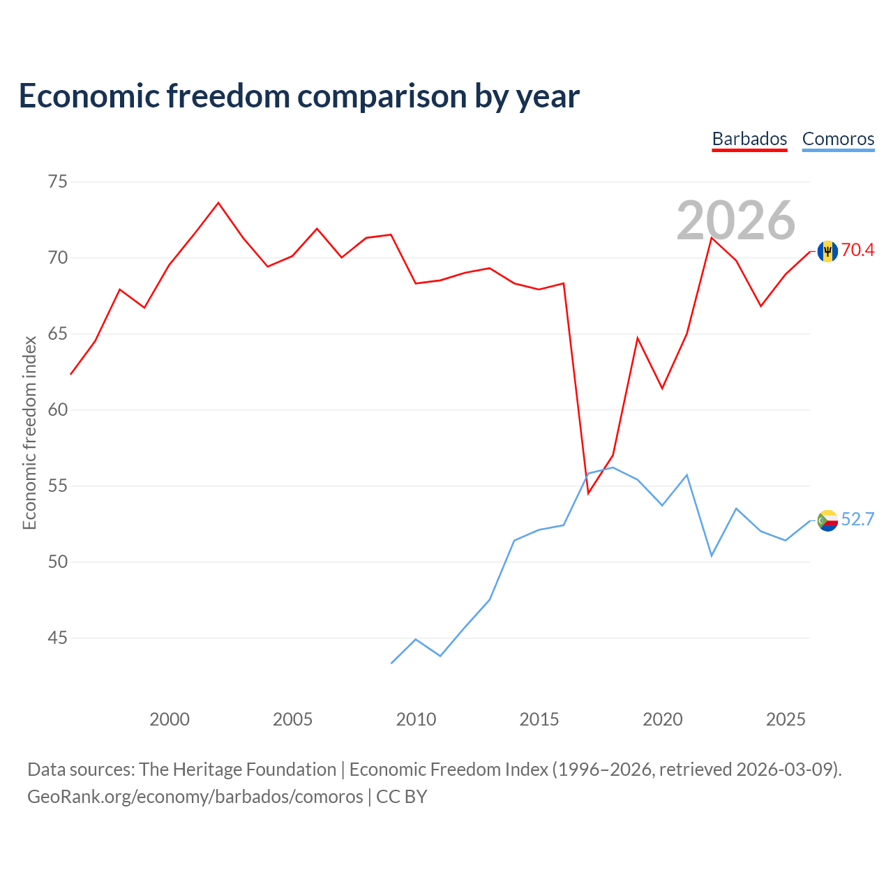 The Economic Freedom Index for Barbados is 70.4, ranking 34/197, compared to 52.7 for Comoros, ranking 145/197. The chart above displays a comparison of annual changes in economic freedom indexes.