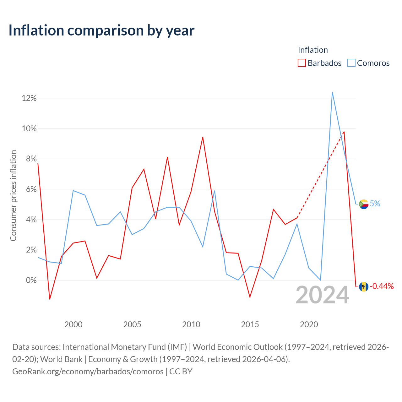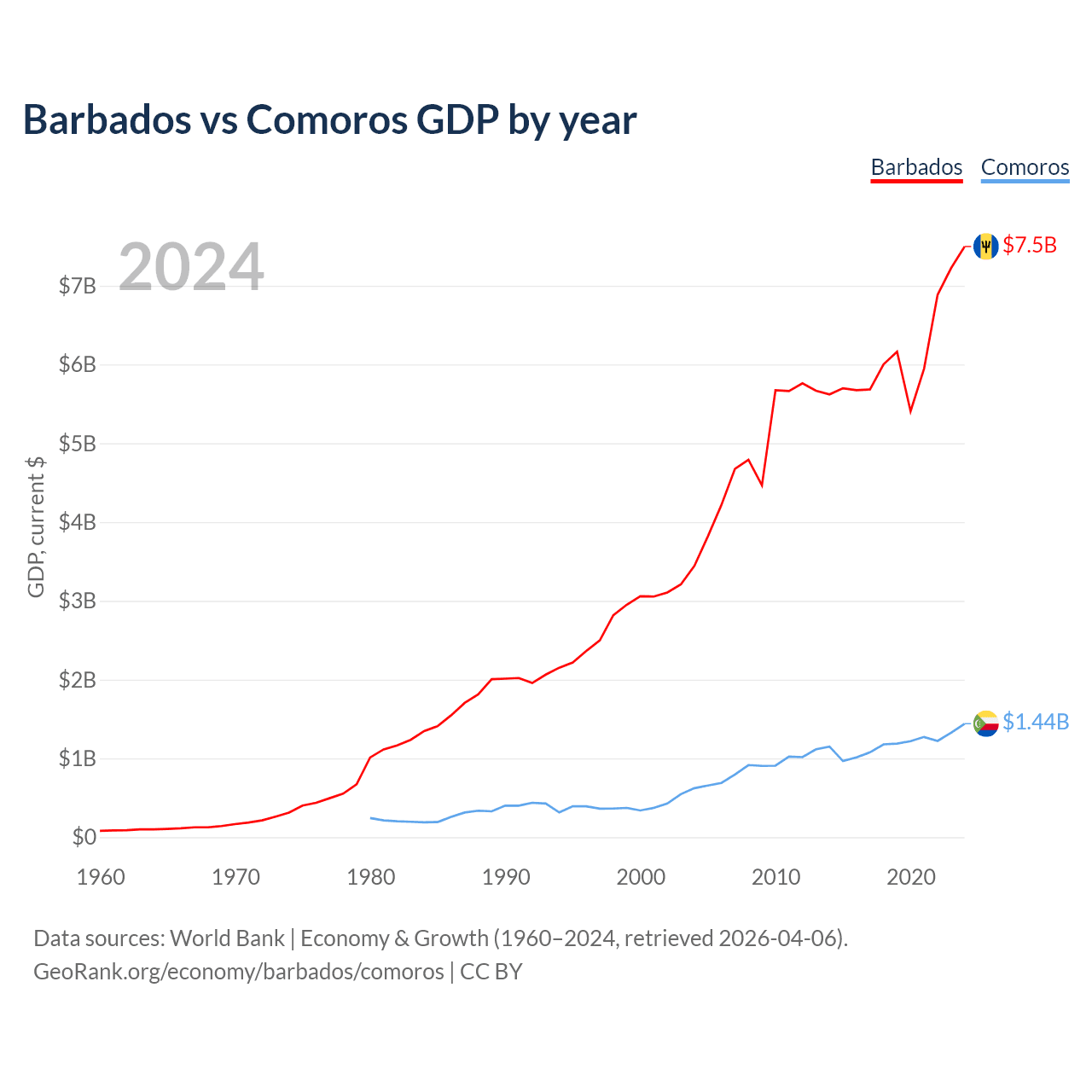 Barbados has a GDP of $7.5B compared to $1.44B for Comoros, ranking 157/197 and 183/197 by economy size, respectively.