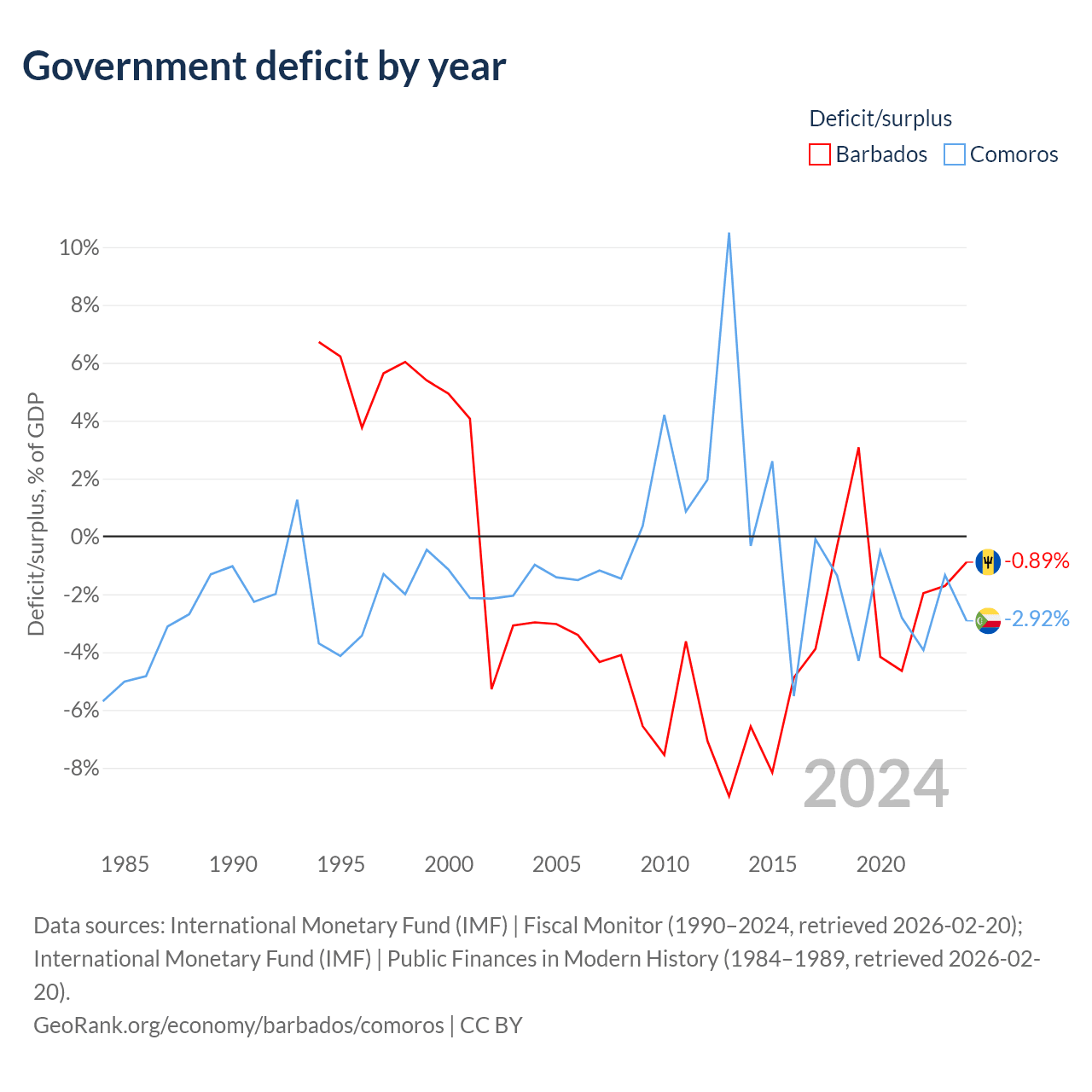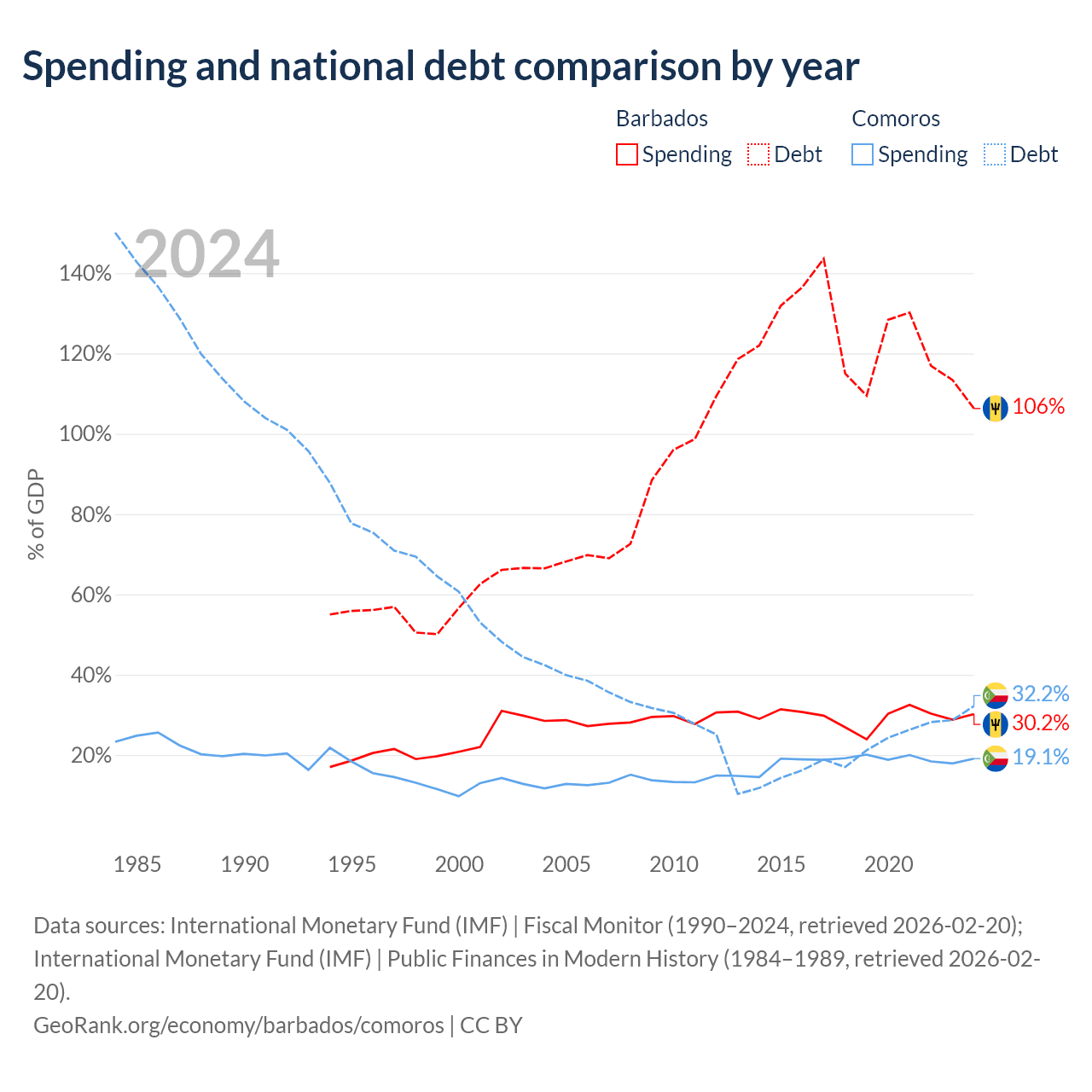 Barbados has $7.97B in government debt (106.3% of GDP), compared to $463M (32.2% of GDP) in Comoros.
