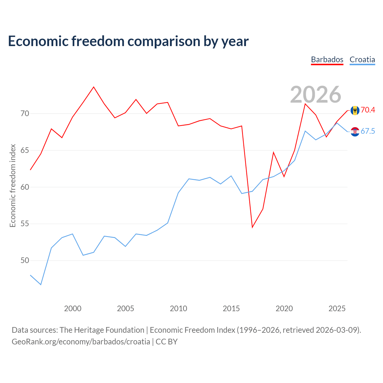 The Economic Freedom Index for Barbados is 70.4, ranking 34/197, compared to 67.5 for Croatia, ranking 56/197. The chart above displays a comparison of annual changes in economic freedom indexes.