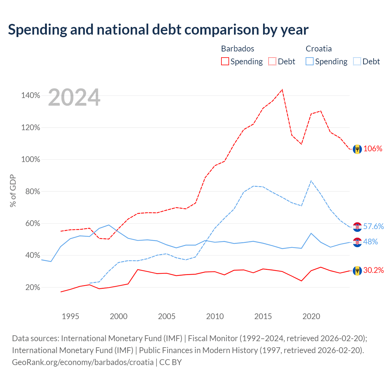 Barbados has $7.97B in government debt (106.3% of GDP), compared to $53.5B (57.6% of GDP) in Croatia.
