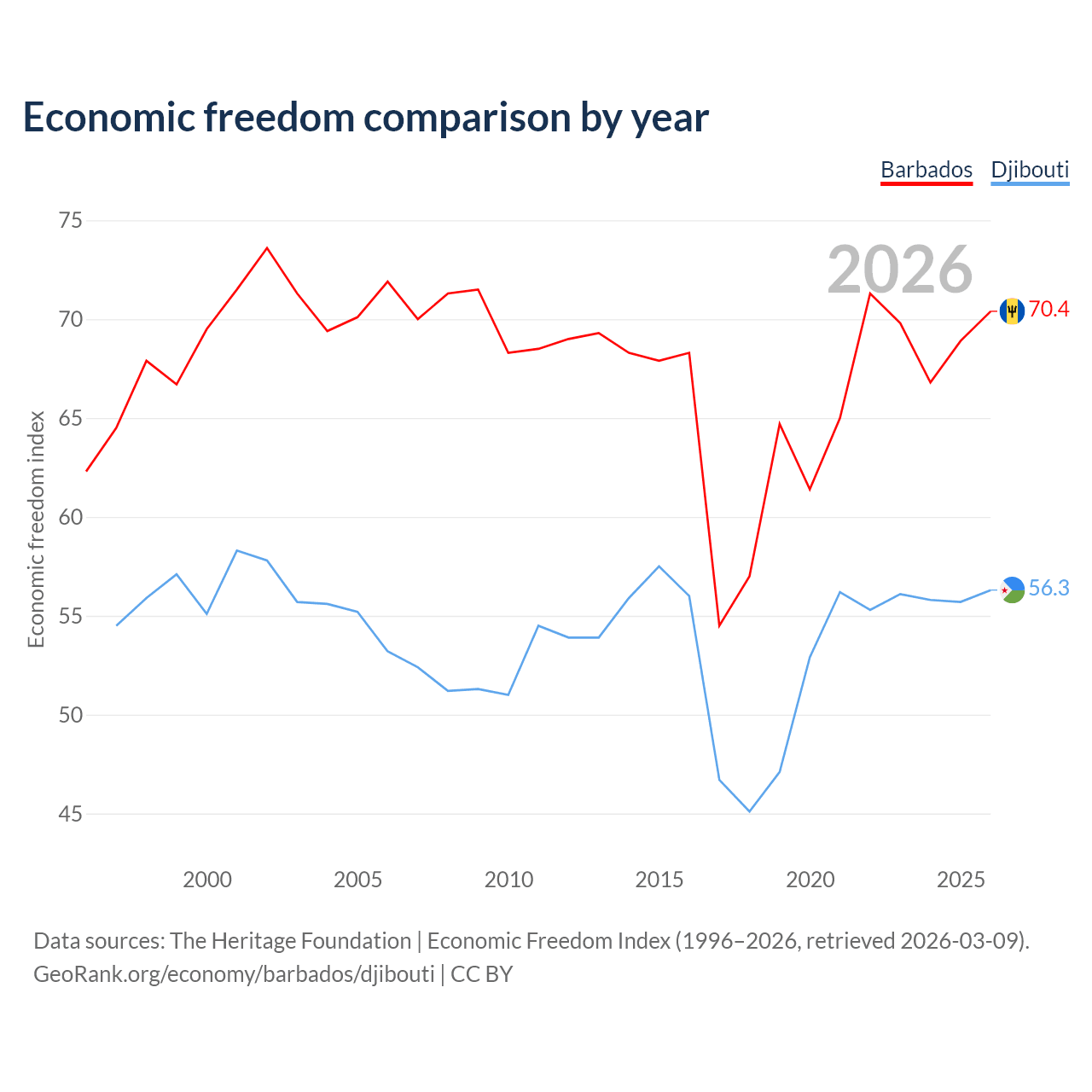 The Economic Freedom Index for Barbados is 70.4, ranking 34/197, compared to 56.3 for Djibouti, ranking 122/197. The chart above displays a comparison of annual changes in economic freedom indexes.