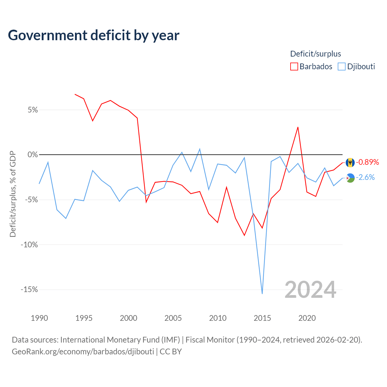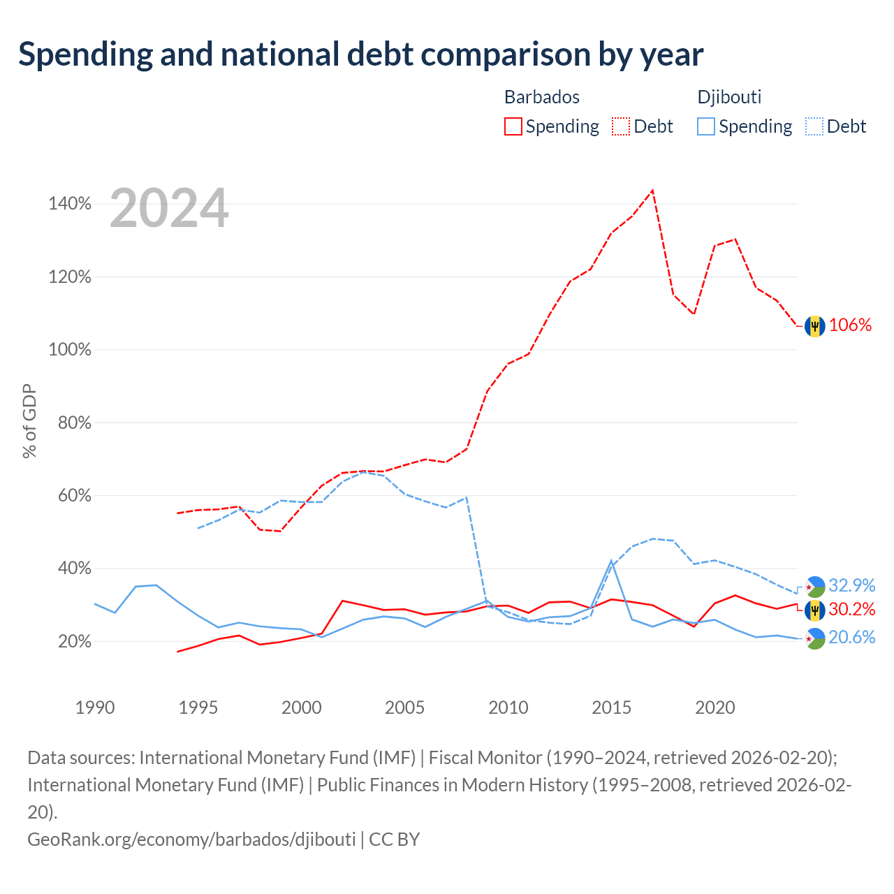 Barbados has $7.97B in government debt (106.3% of GDP), compared to $1.36B (32.9% of GDP) in Djibouti.