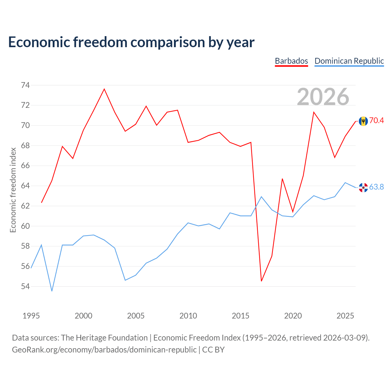The Economic Freedom Index for Barbados is 70.4, ranking 34/197, compared to 63.8 for the Dominican Republic, ranking 77/197. The chart above displays a comparison of annual changes in economic freedom indexes.