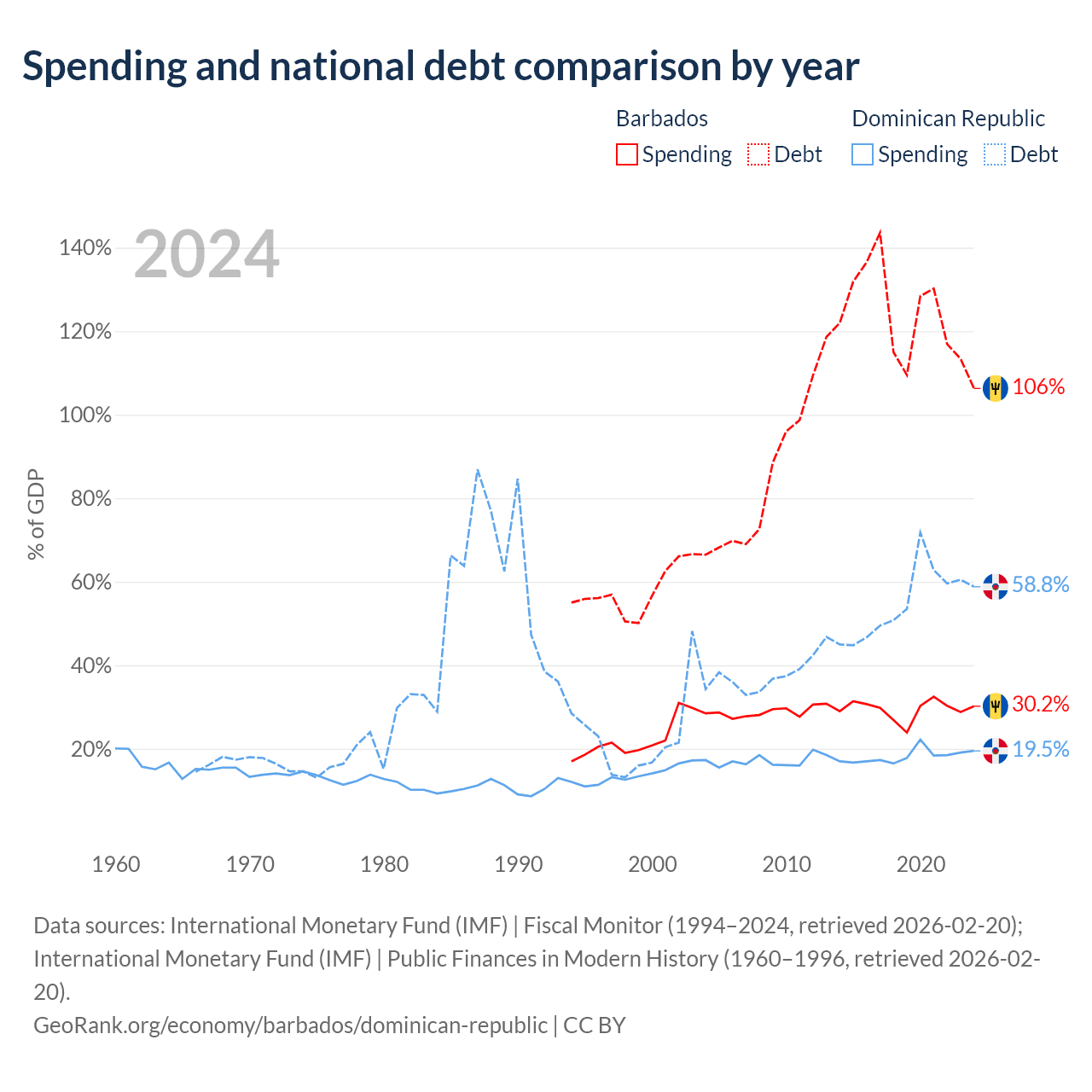 Barbados has $7.97B in government debt (106.3% of GDP), compared to $73.1B (58.8% of GDP) in the Dominican Republic.