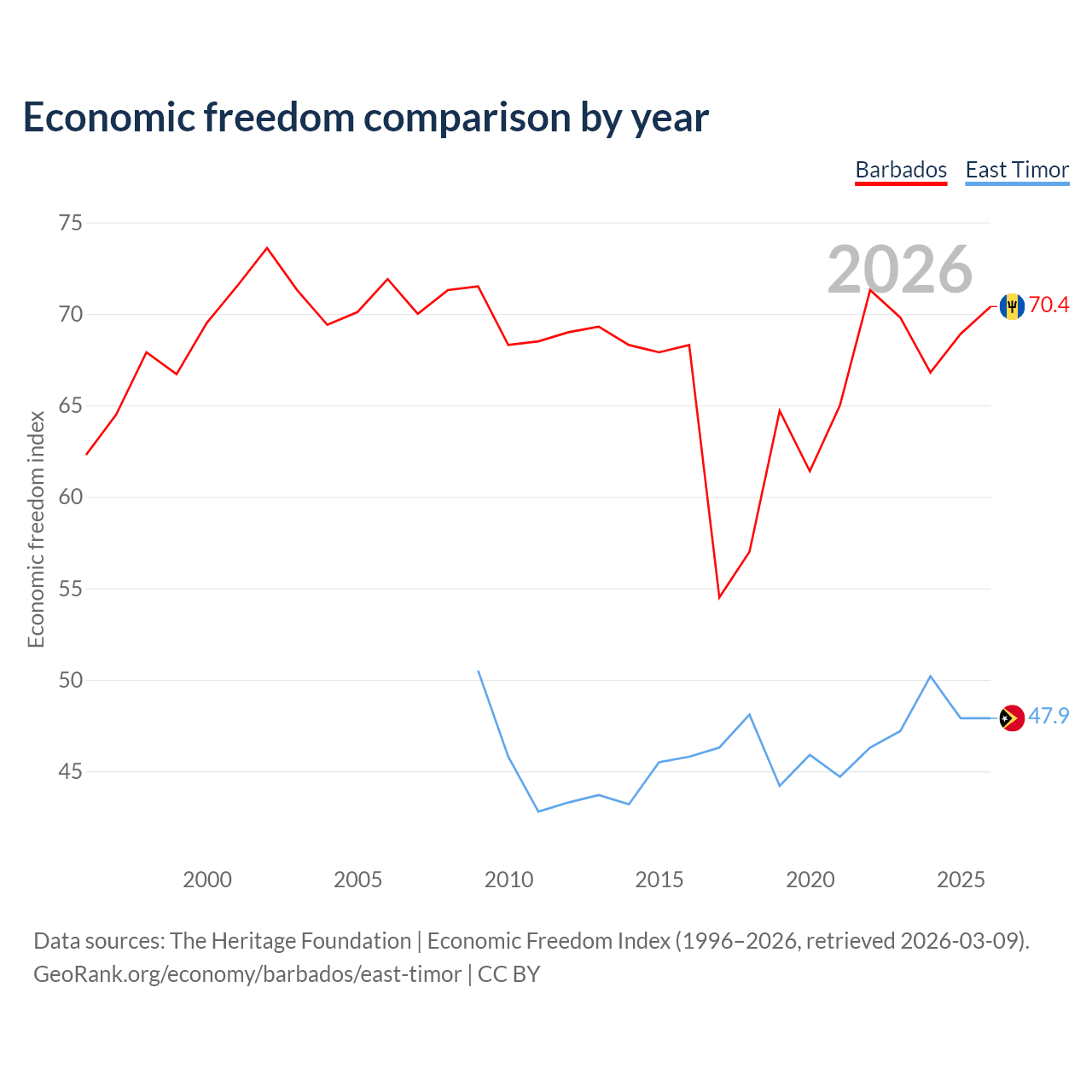 The Economic Freedom Index for Barbados is 70.4, ranking 34/197, compared to 47.9 for East Timor, ranking 173/197. The chart above displays a comparison of annual changes in economic freedom indexes.