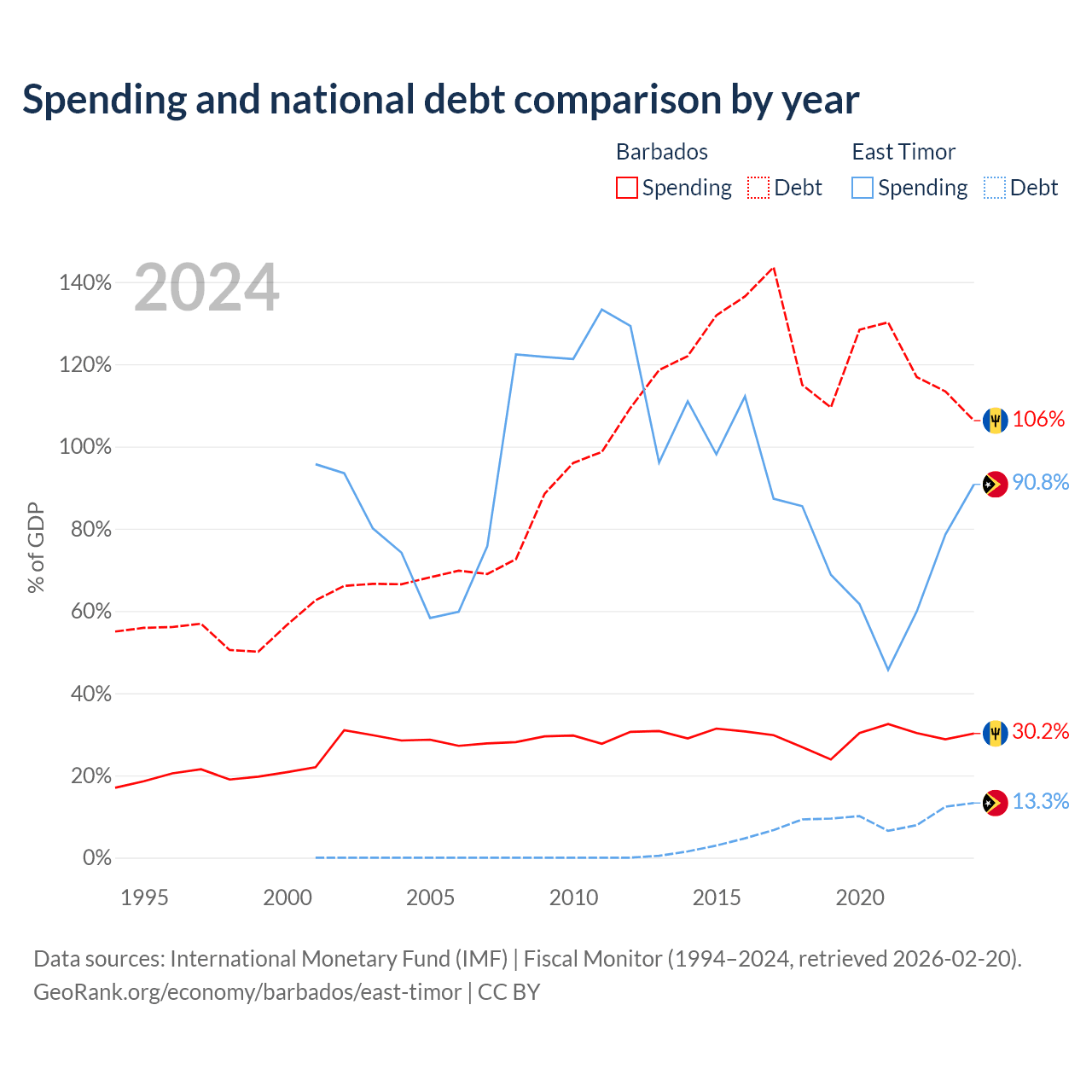 Barbados has $7.97B in government debt (106.3% of GDP), compared to $249M (13.3% of GDP) in East Timor.