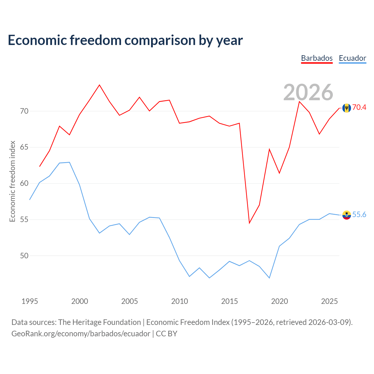 The Economic Freedom Index for Barbados is 70.4, ranking 34/197, compared to 55.6 for Ecuador, ranking 127/197. The chart above displays a comparison of annual changes in economic freedom indexes.