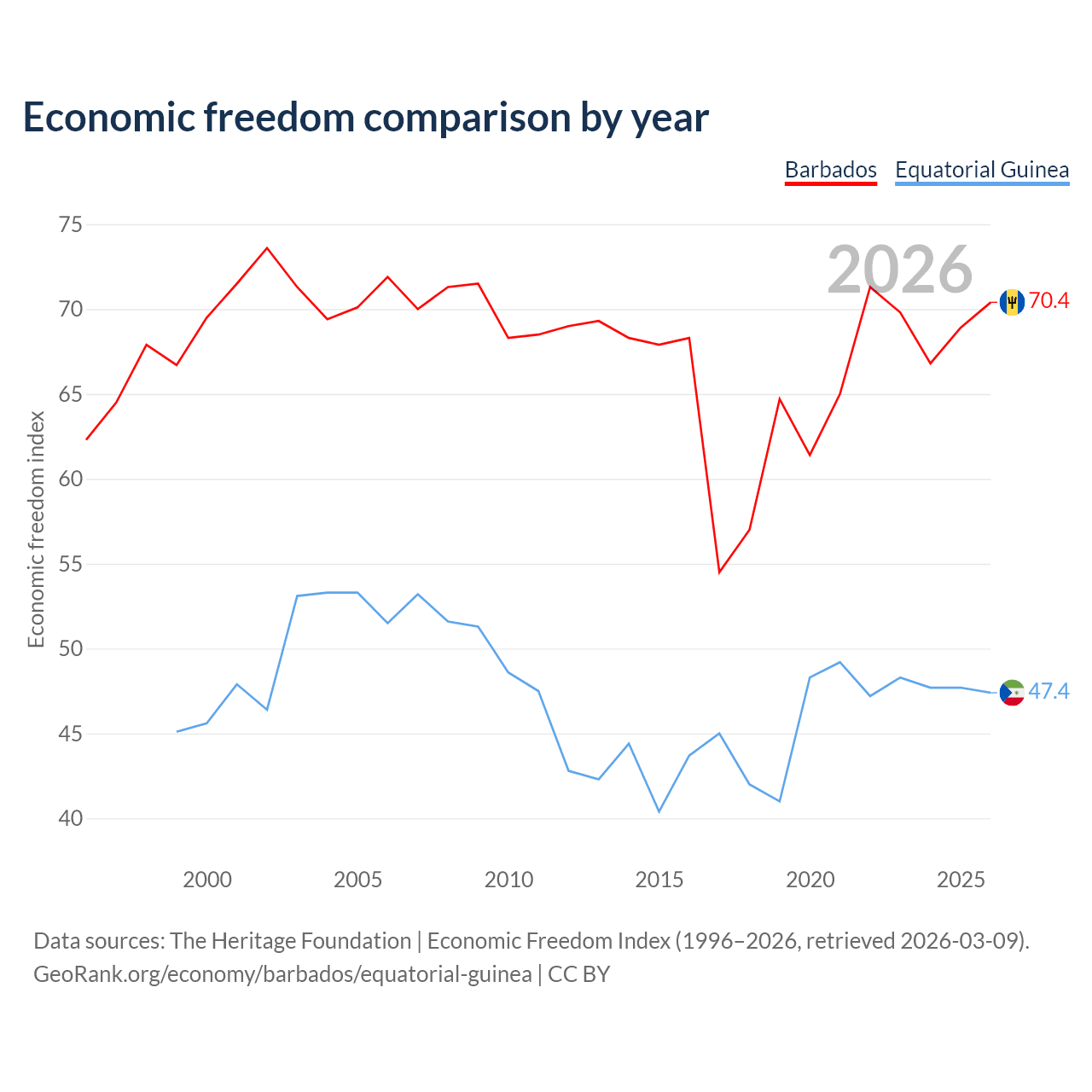 The Economic Freedom Index for Barbados is 70.4, ranking 34/197, compared to 47.4 for Equatorial Guinea, ranking 175/197. The chart above displays a comparison of annual changes in economic freedom indexes.