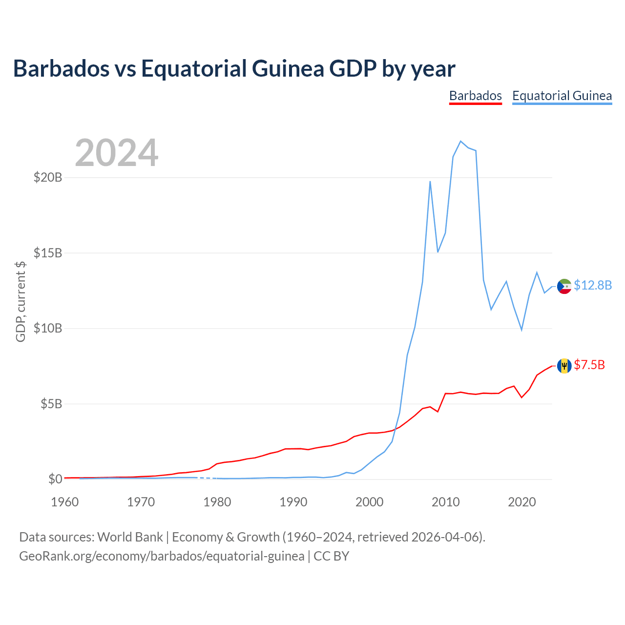 Barbados has a GDP of $7.5B compared to $12.8B for Equatorial Guinea, ranking 157/197 and 148/197 by economy size, respectively.