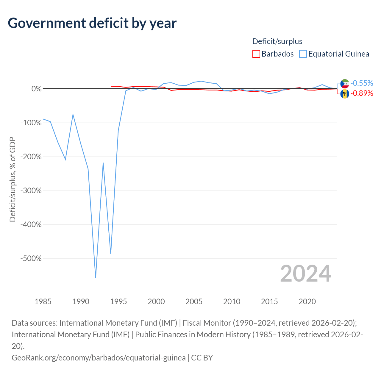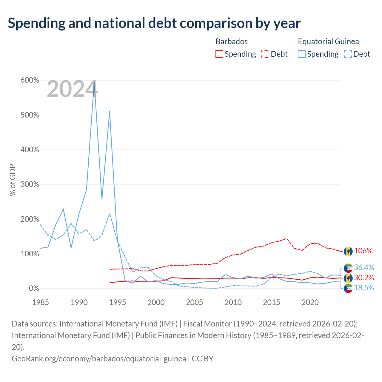 Barbados has $7.97B in government debt (106.3% of GDP), compared to $4.65B (36.4% of GDP) in Equatorial Guinea.