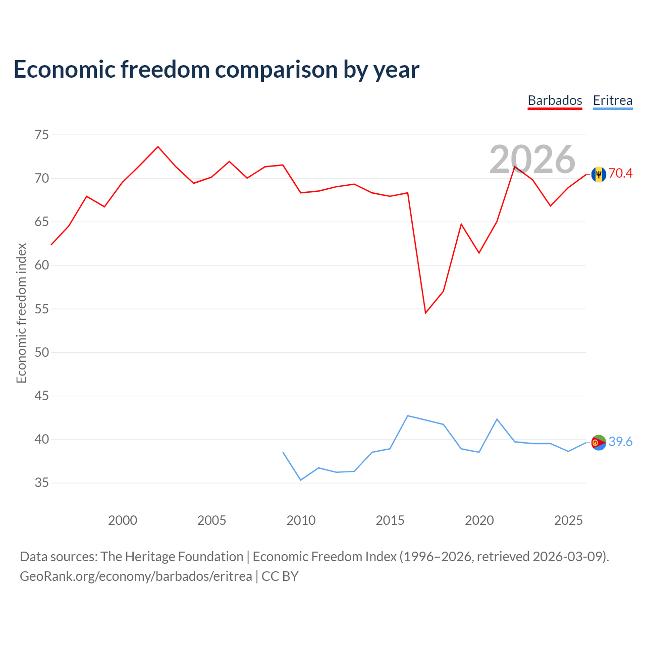 The Economic Freedom Index for Barbados is 70.4, ranking 34/197, compared to 39.6 for Eritrea, ranking 188/197. The chart above displays a comparison of annual changes in economic freedom indexes.