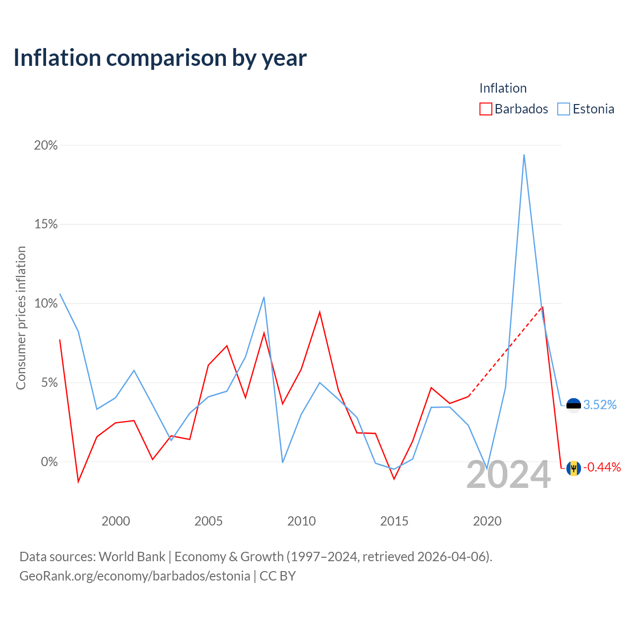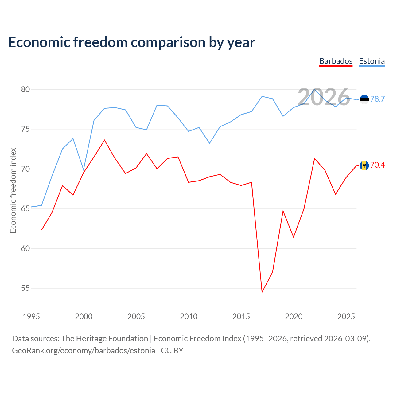 The Economic Freedom Index for Barbados is 70.4, ranking 34/197, compared to 78.7 for Estonia, ranking 10/197. The chart above displays a comparison of annual changes in economic freedom indexes.