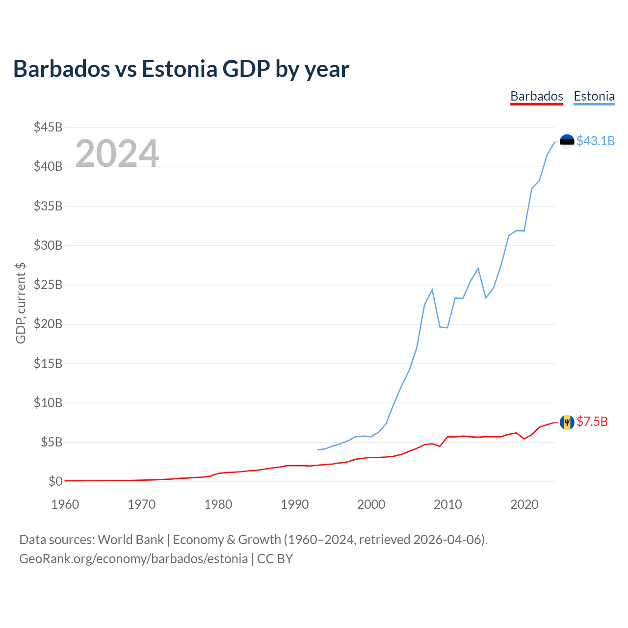 Barbados has a GDP of $7.5B compared to $43.1B for Estonia, ranking 157/197 and 100/197 by economy size, respectively.