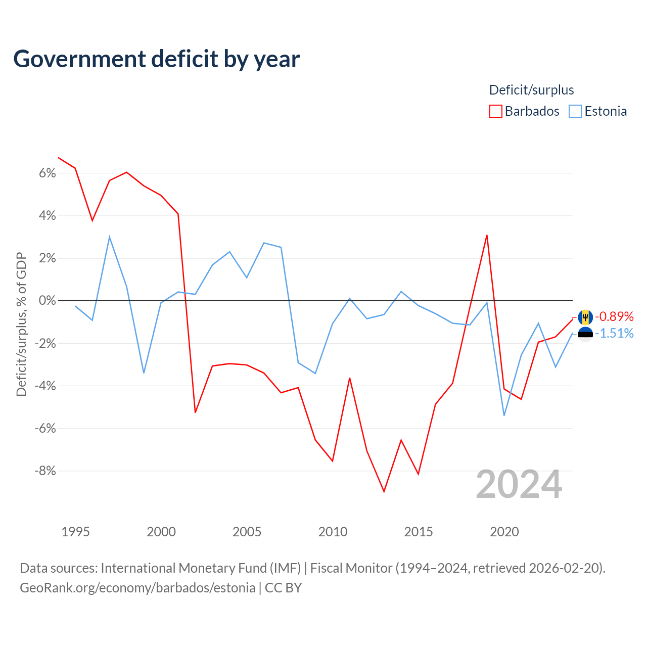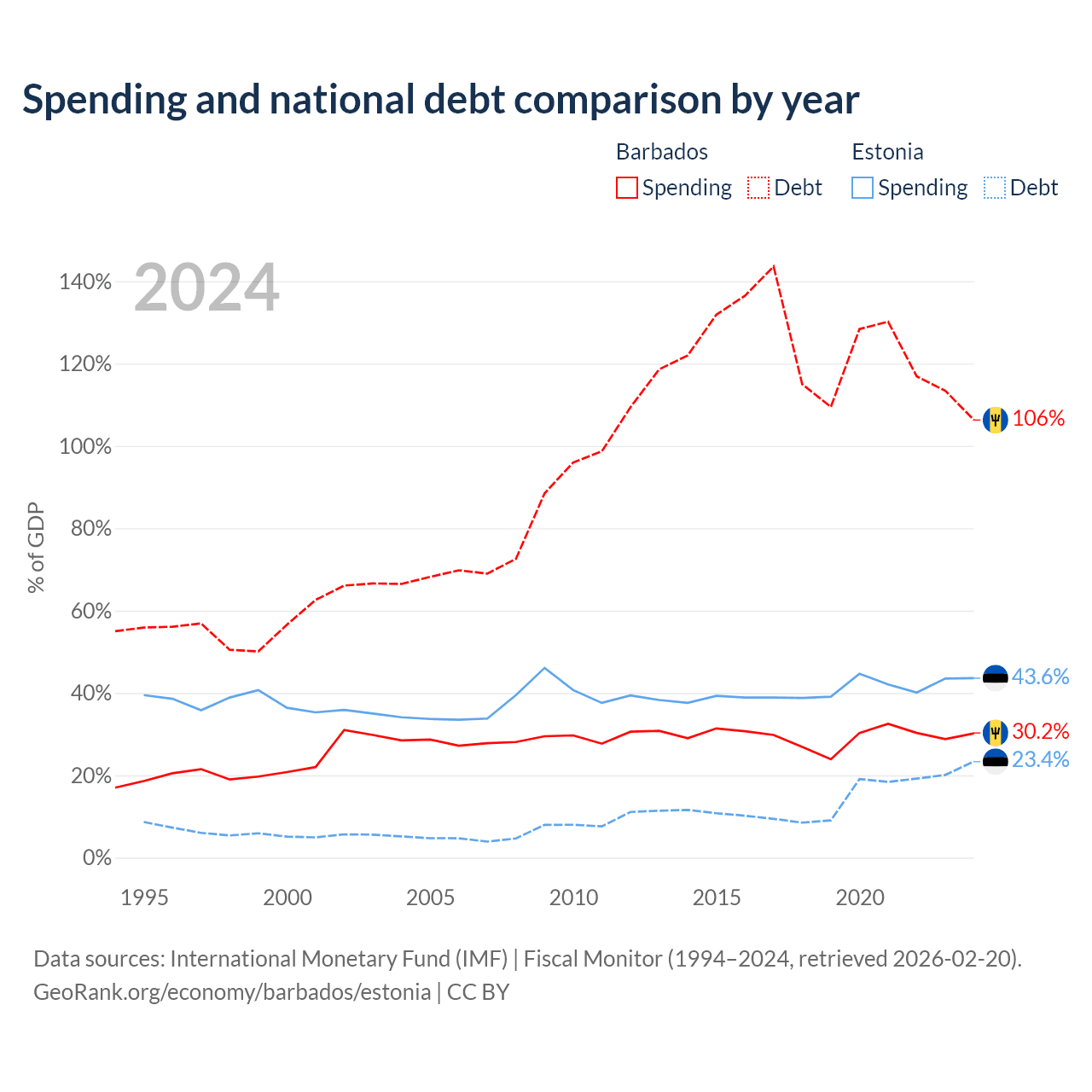 Barbados has $7.97B in government debt (106.3% of GDP), compared to $10.1B (23.4% of GDP) in Estonia.
