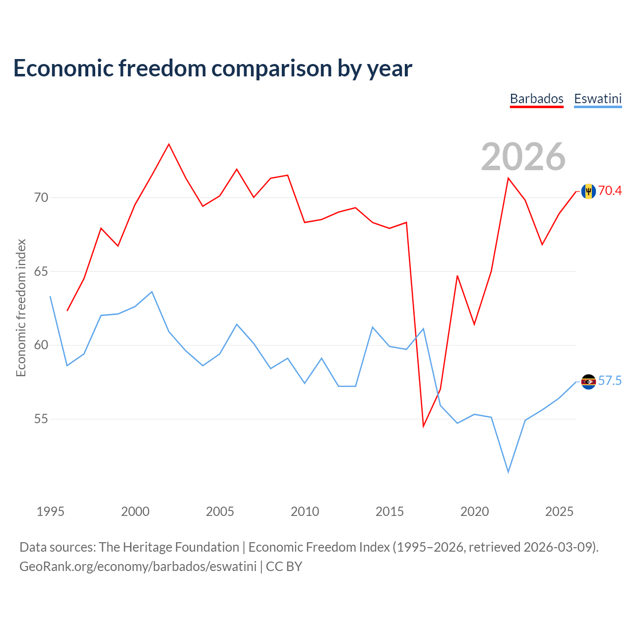 The Economic Freedom Index for Barbados is 70.4, ranking 34/197, compared to 57.5 for Eswatini, ranking 116/197. The chart above displays a comparison of annual changes in economic freedom indexes.