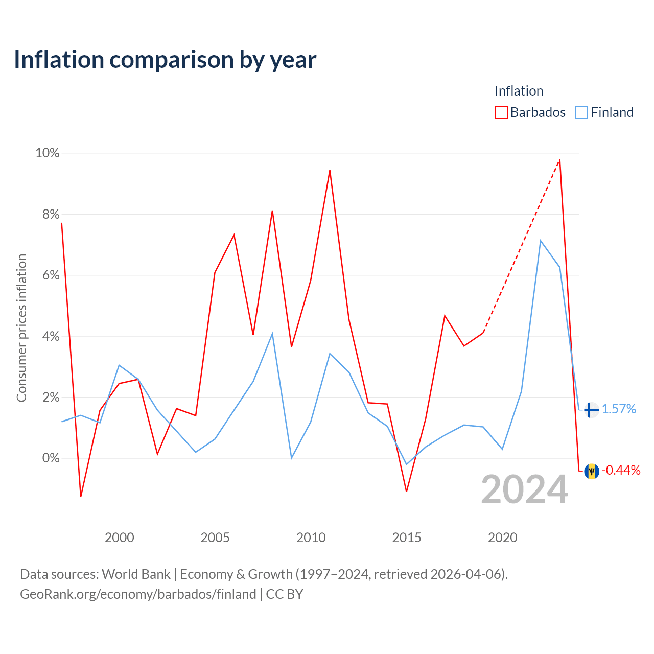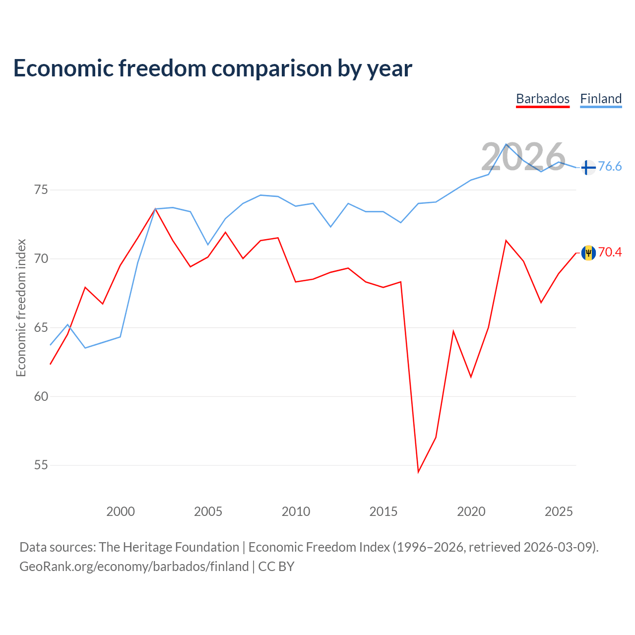 The Economic Freedom Index for Barbados is 70.4, ranking 34/197, compared to 76.6 for Finland, ranking 15/197. The chart above displays a comparison of annual changes in economic freedom indexes.