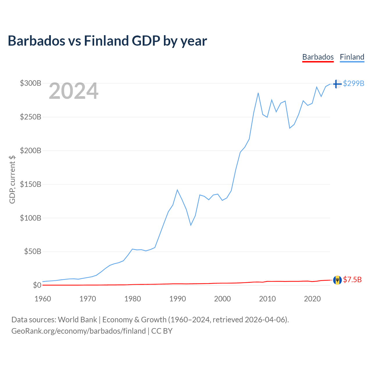 Barbados has a GDP of $7.5B compared to $299B for Finland, ranking 157/197 and 47/197 by economy size, respectively.