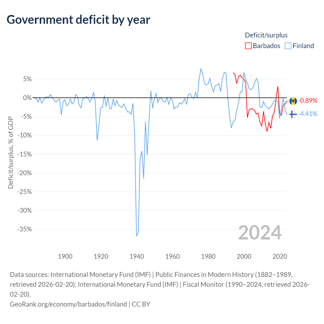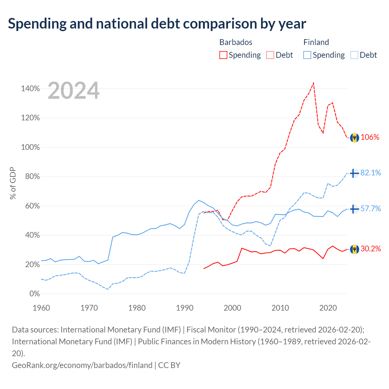 Barbados has $7.97B in government debt (106.3% of GDP), compared to $245B (82.1% of GDP) in Finland.