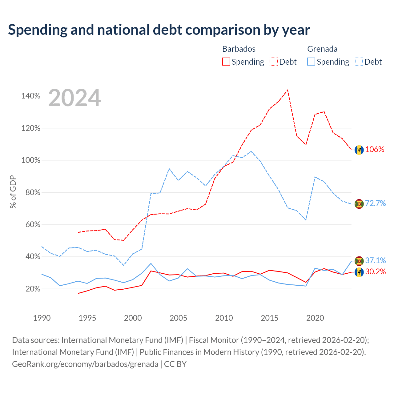 Barbados has $7.97B in government debt (106.3% of GDP), compared to $997M (72.7% of GDP) in Grenada.