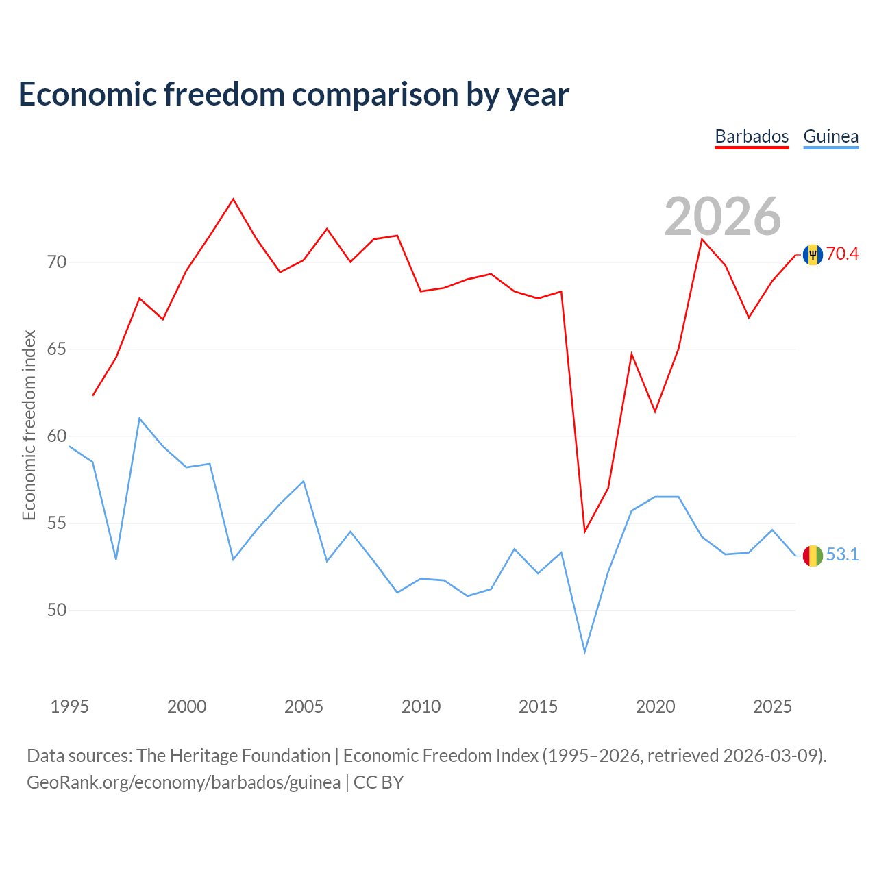 The Economic Freedom Index for Barbados is 70.4, ranking 34/197, compared to 53.1 for Guinea, ranking 141/197. The chart above displays a comparison of annual changes in economic freedom indexes.