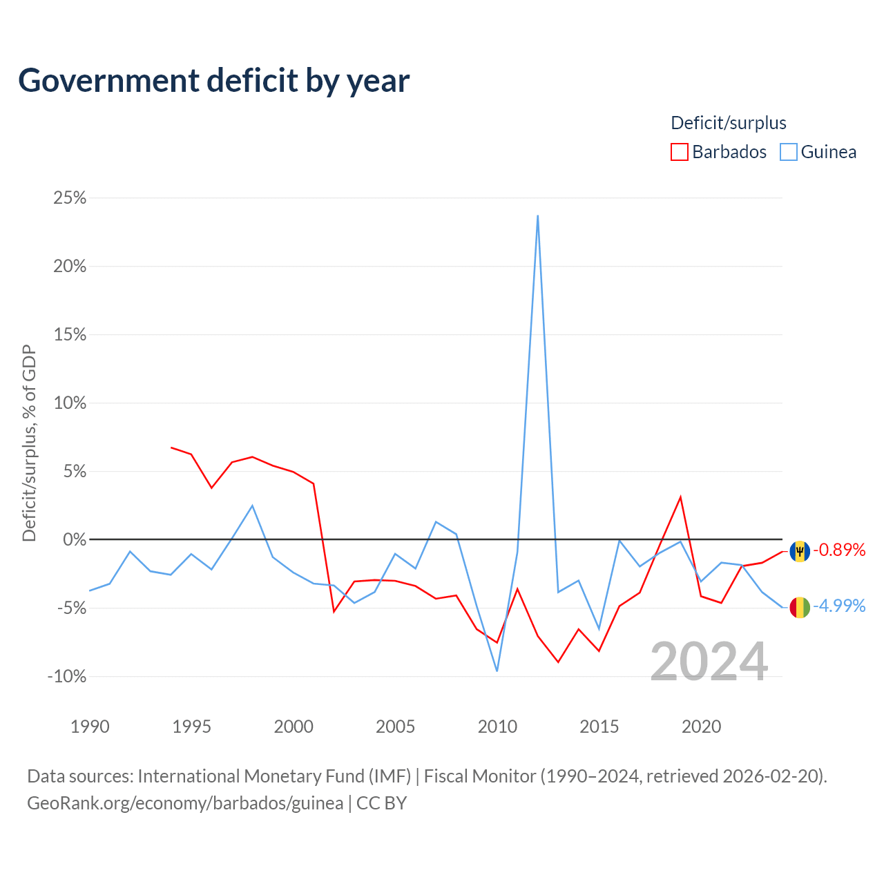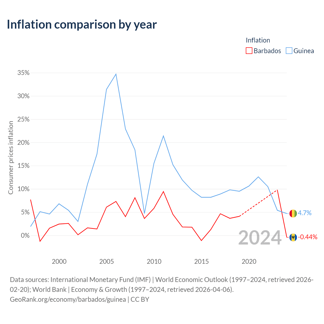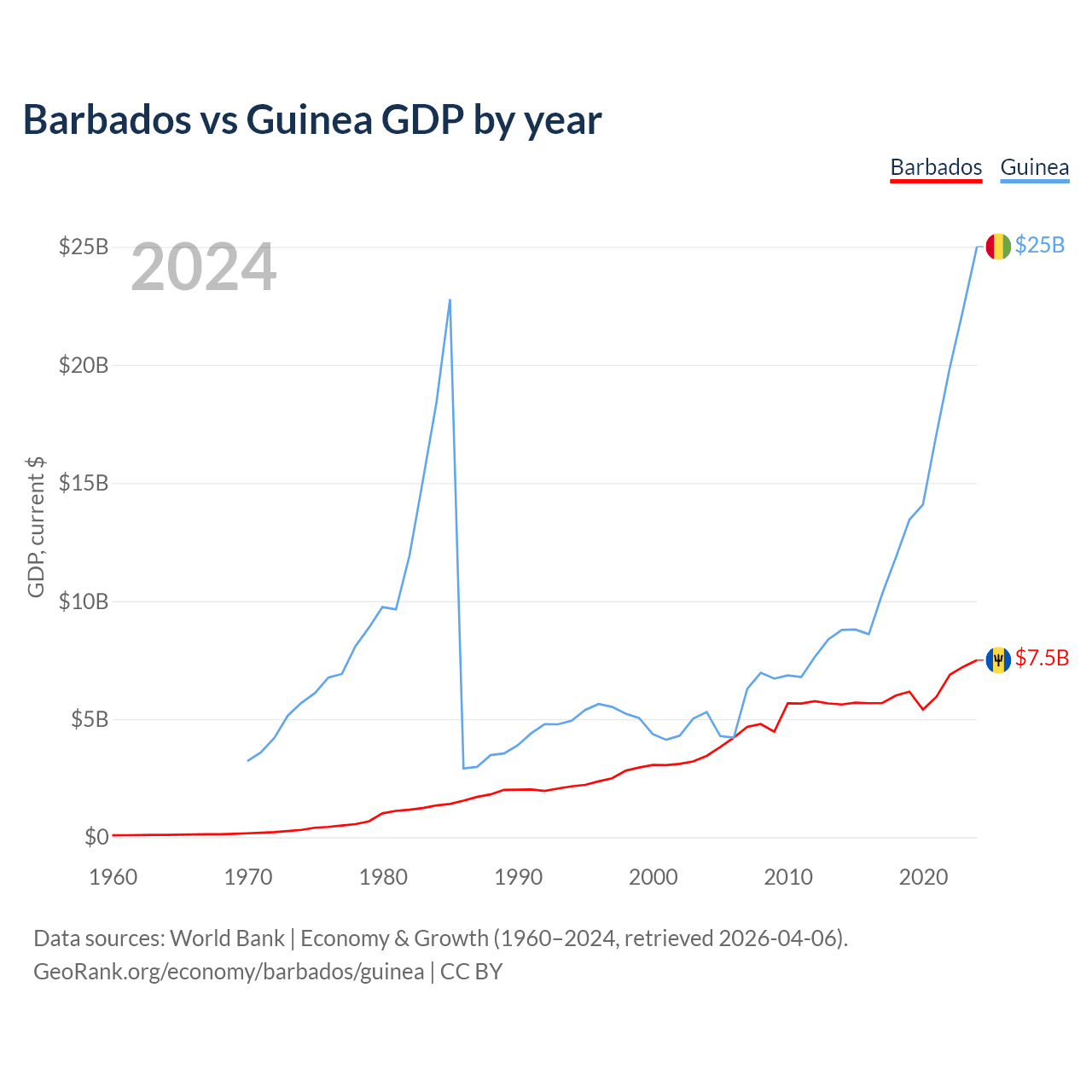 Barbados has a GDP of $7.5B compared to $25B for Guinea, ranking 157/197 and 118/197 by economy size, respectively.