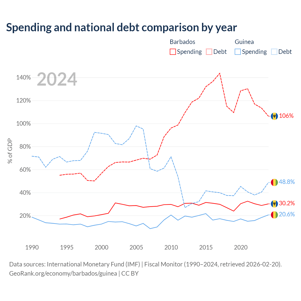 Barbados has $7.97B in government debt (106.3% of GDP), compared to $12.2B (48.8% of GDP) in Guinea.